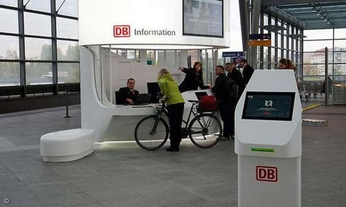 Die neue DB Information 4.0 wird an rund 80 Bahnhöfen in Deutschland der zentrale Anlaufpunkt für Reisende und Besucher, um schnell und noch individueller Informationen und Hilfestellungen zu bekommen. Über die neue DB Information 4.0 sehen Kunden bereits aus der Ferne auf einem großen Monitor aktuelle Abfahrtszeiten, Fahrplanänderungen oder Informationen zu Anschlüssen. Neu sind Selbstbedienungsterminals, um Online-Tickets auszudrucken oder eine Mobilitätshilfe zu bestellen. Startups, Kunden, Verbände, Besteller für den Nahverkehr und Eisenbahnverkehrsunternehmen wirkten bei der Entwicklung mit. Der Umbau aller bestehenden DB Informationen bundesweit beginnt ab Herbst 2017. (Bildquelle: Deutsche Bahn)
