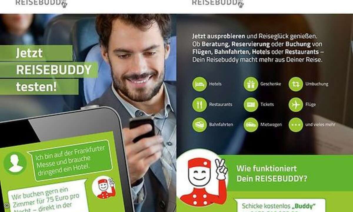 Der “Reisebuddy” ist ein kostenloser SMS-Concierge der Deutschen Bahn, an den man alle Wünsche vor, während und nach der Reise richten kann. Er hilft bei jeglichen Fragen zum Thema Mobilität weiter, reserviert den Tisch beim Lieblingsitaliener, sucht das passende Hotel, bucht Flug-, Bahn- und Busfahrkarten, gibt Sightseeing-Tipps, organisiert kurzfristig einen Blumenstrauß und vieles mehr. (Bildquelle: Deutsche Bahn)