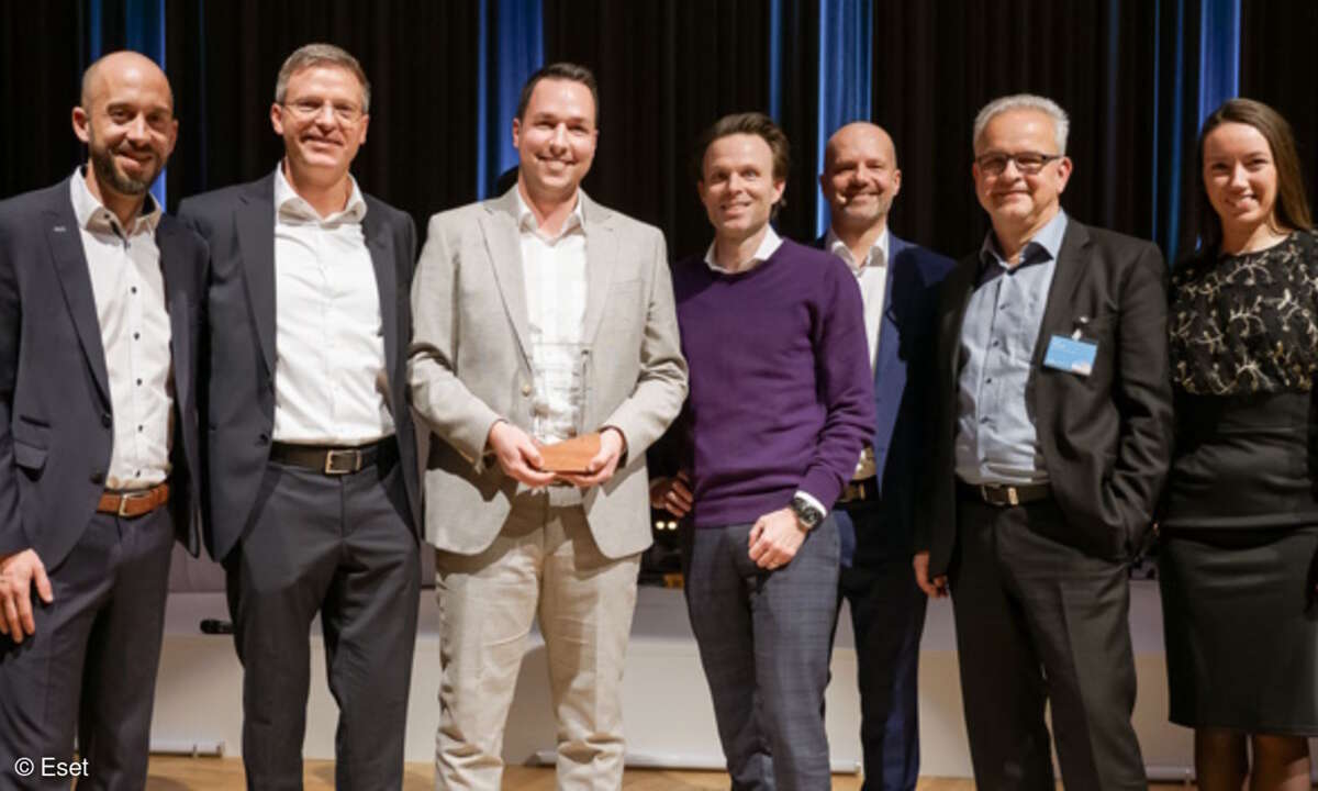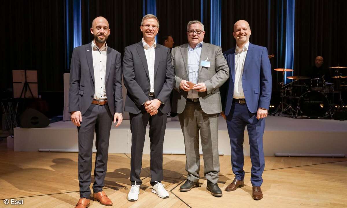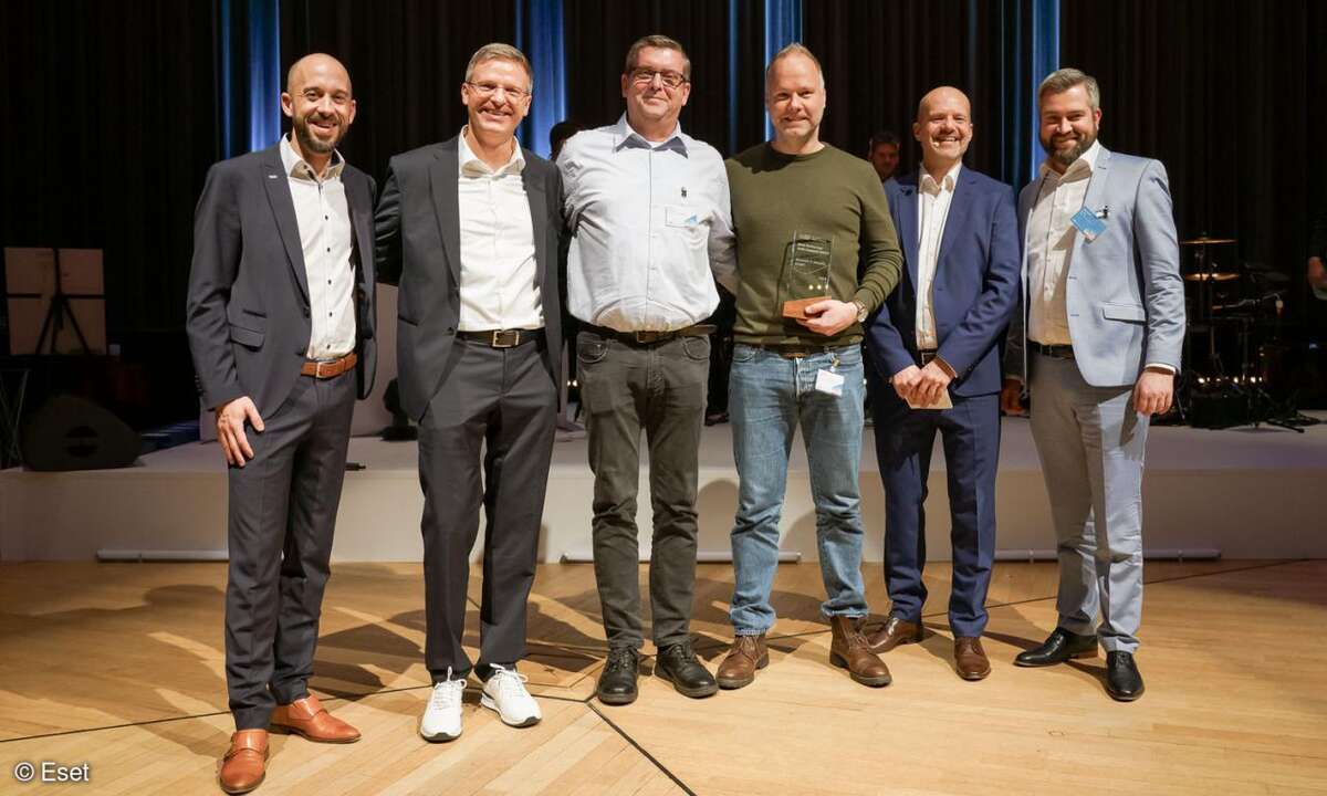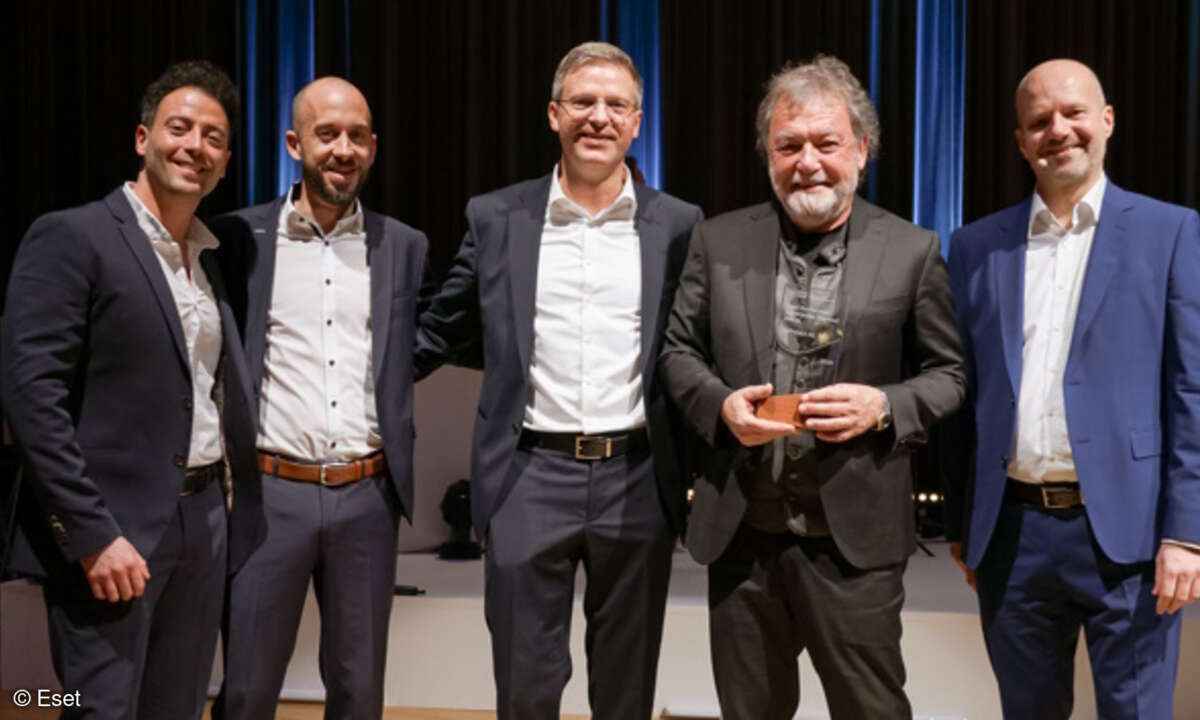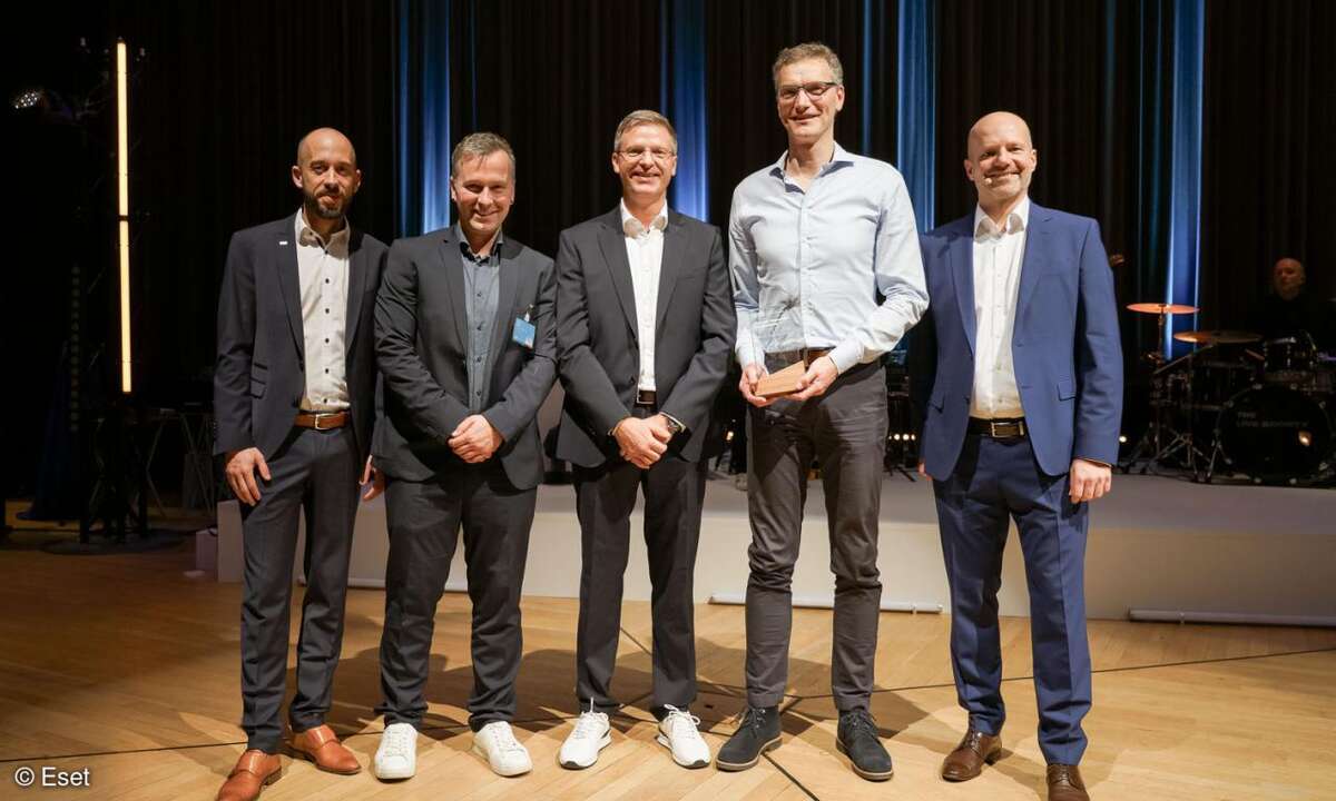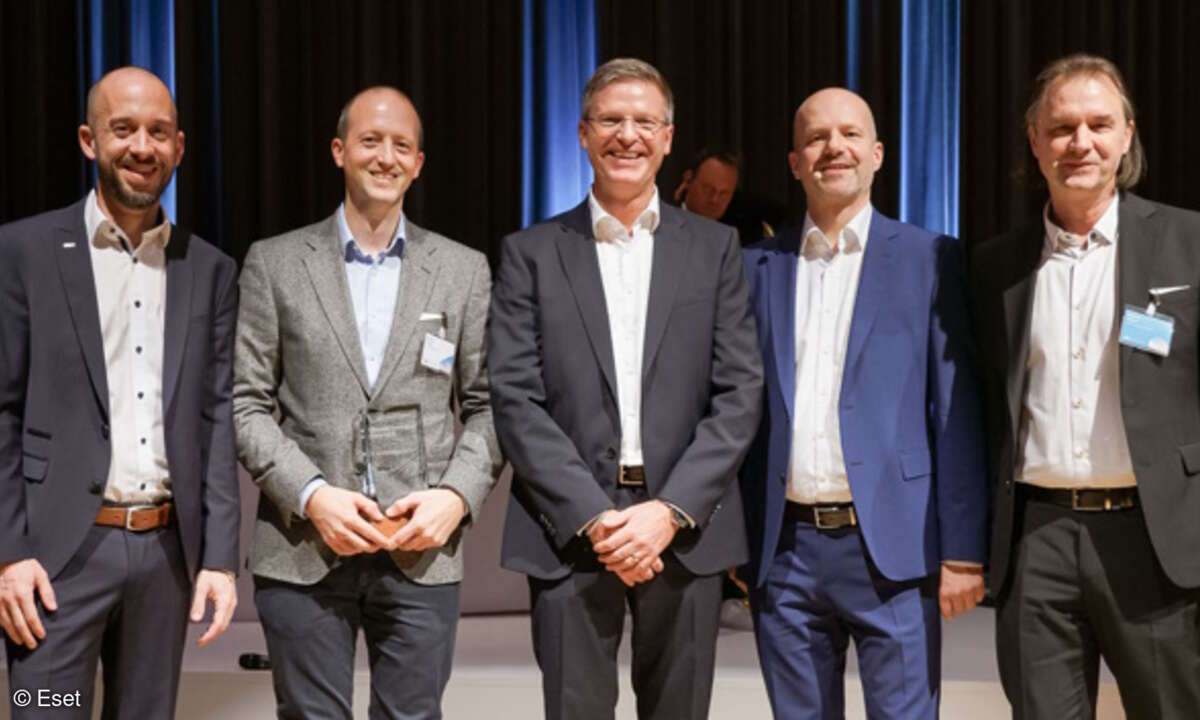 Als „Best Performer“ im Enterprise-Segment konnte sich der Münchner Cybersecurity-Dienstleister CyProtect hervortun. Er ist auf den Bereich IT/OT und IoT spezialisiert. Im Bild (v.l.n.r.): Pedro da Fonte (CyProtect), Tobias Neugebauer (Eset), Holger Suhl (Eset), Basilius Niedermeyer (CyProtect), Peter Neumeier (Eset)