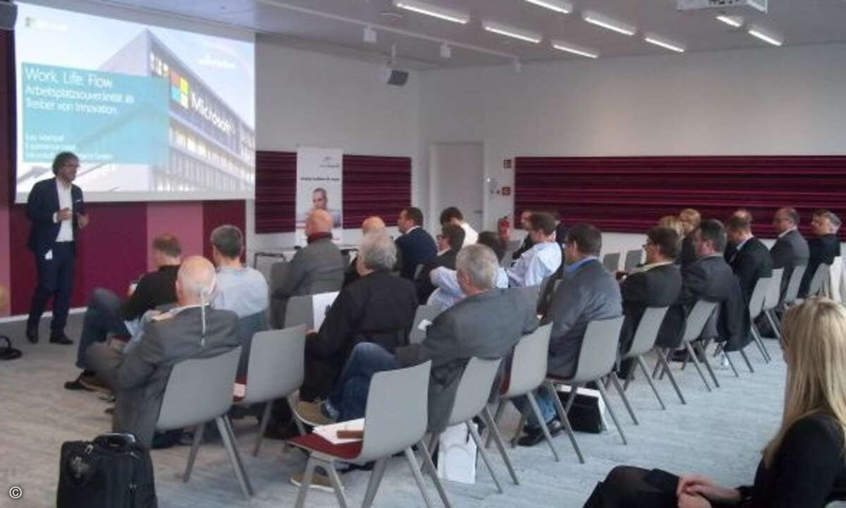 Kay Mantzel von Microsoft verdeutlichte den Teilnehmern das offene Konzept des neuen Microsoft Gebäudes. (Bildquelle: Würth Phoenix)