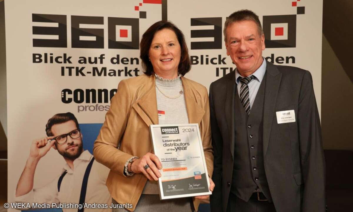 Barbara Koch von TD Synnex nahm erfreut die Auszeichnung als „excellent distributor“ von Jörg Schröper (connect professional) entgegen. Der Distributor und Lösungsaggregator für das IT-Ecosystem hat mehr als 150.000 Kunden in über 100 Ländern. 23.000 Mitarbeiter widmen sich der Aufgabe, IT-Produkte, -Dienstleistungen und -Lösungen von über 2.500 Technologieanbietern zu verknüpfen. Das Edge-to-Cloud-Portfolio des Distributors ist unter anderem in den Segmenten Cloud, Cybersecurity, Big Data/Analytics, IoT, Mobility und Everything-as-a-Service verankert. Bei der connect professional-Leserwahl punktete TD Synnex vor allem in den Kategorien Tiefe und Breite des Portfolios, Liefertreue und Nachhaltigkeit des Portfolios.