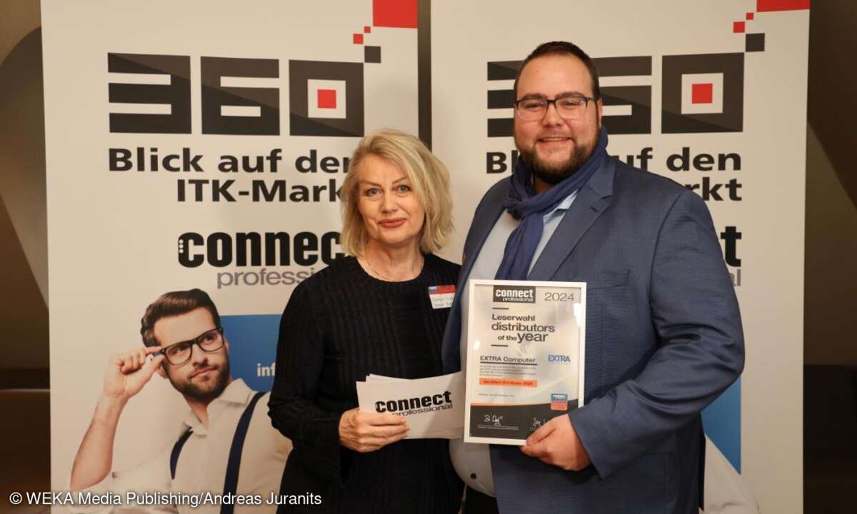 Erstmals in der Gewinnerriege belegte der Distributor und Hersteller Extra Computer gleich Platz drei. Überdurchschnittliche Bewertungen gab es in mehreren Kategorien; Note 9 und besser wurde für Erreichbarkeit der Hotline, Fachkompetenz des Personals, Liefertreue, Retouren/RMA und Unterstützung im Projektgeschäft vergeben. Gelobt wurde beispielsweise die tolle Zusammenarbeit seit über 16 Jahren. Überreicht wurde die Gewinnerurkunde durch Michaela Wurm (connect professional) an Uwe Silberhorn.