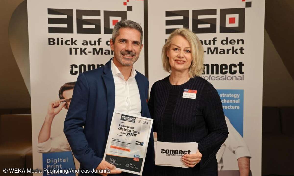 Michaela Wurm (connect professional) überreichte dem „excellent distributor“ Macle – vertreten durch Andreas De Matteis – die Urkunde. Seit 1999 agiert Macle als Value Added Distributor im europäischen Markt und bevorratet im eigenen Online-Shop mehr als 50.000 verfügbare IT-Hardware und Software-Artikel. Hier befindet sich das komplette IT-Sortiment, wie beispielsweise Server- und Storagesysteme, Server- und Storage-Zubehör. Die Leserwahlteilnehmer vergaben für die Arbeit des VAD unter anderem Höchstpunkte in den Sparten Liefertreue, Fachkompetenz des Personals und Finanzierungsservices/Zahlungsziele.