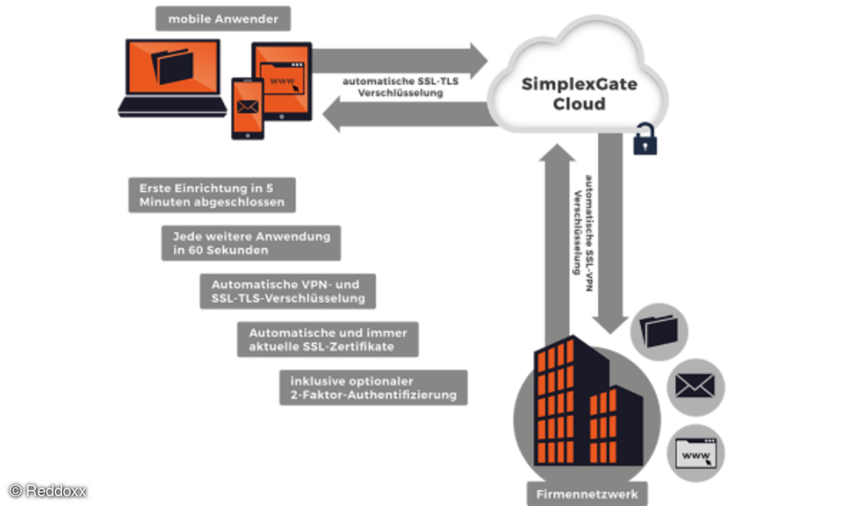 Wenn in kleineren Unternehmen das IT-Know-how fehlt, kann nicht so schnell eine sichere VPN-Struktur implementiert werden, um flächendeckend Homeoffice zu gewährleisten. Reddoxx bietet deshalb mit "Simplexgate" für 30 Tage kostenfrei die Möglichkeit, eine VPN-Verbindung über die Reddoxx-Cloud herzustellen, wodurch Mitarbeitern ein Remote-Zugriff auf E-Mails oder auch CRM-Systeme ermöglicht wird.