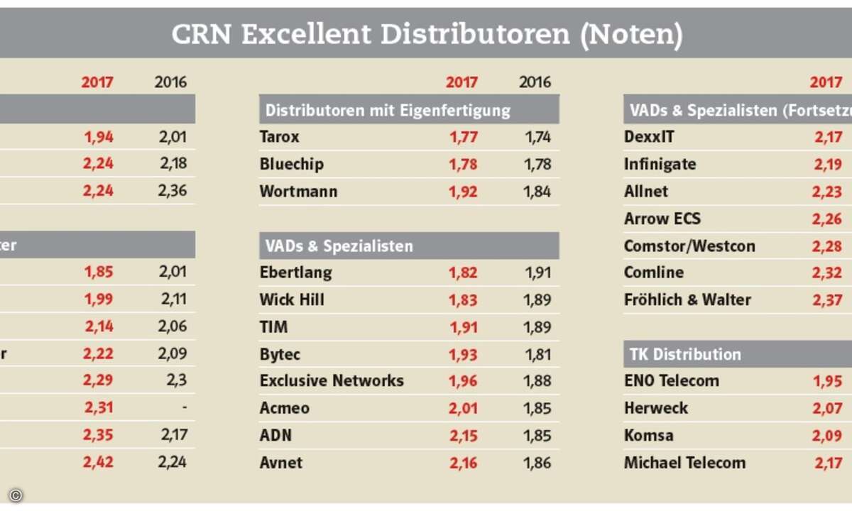 Das beste Jahresergebnis erzielte der Distributor und Hersteller und Tarox mit der Gesamtnote 1,77. Das Unternehmen aus Lünen holt damit sogar das Triple - dreimal Jahresbester in Folge - einen solchen Seriensieg hat es in der Geschichte der CRN-Distributorenwahl noch nicht gegeben. Andererseits wird auch in diesem Jahr wieder deutlich, dass vor allem die Distributoren mit Eigenmarke und VADs oder Spezialdistributoren bei den Fachhandelskunden die Nase vorne haben. Denn hinter Tarox rangiert mit Bluechip (Note 1,78) noch ein weiterer Grossist und Fertiger auf Platz zwei und auch die Wortmann AG fährt in ihrem Jubiläumsjahr mit Note 1,92 ein gutes Ergebnis ein und schafft locker den Sprung in die Top Ten. Auf den vorderen Plätzen des Gesamtrankings finden sich des Weiteren fokussierte Anbieter wie der Software-Distributor Ebertlang (Note 1,82), der gleich mehrere Plätze gegenüber dem Vorjahresergebnis gut macht und diesmal auf Platz drei landet. Diesmal schafft es mit Also aber auch ein Broadliner unter die Top Ten der Jahreswertung. Also allerdings kann sein Ergebnis diesmal im Vergleich zum Vorjahr von Note 2,01 auf auf 1,94 verbessern und rangiert damit auf Platz neun.