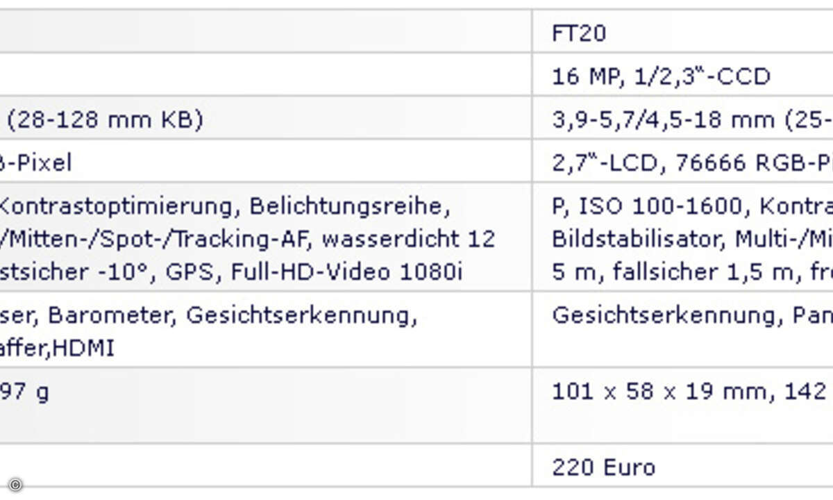 Bei den robusten Modellen übernimmt die FT20 für 220 Euro mit 16-Megapixel-CCD und versenktem 25-100-mm-Periskop-Zoom die Rolle der „überall-dabei“-Familienkamera, während sich die 400 Euro teure FT4 mit 12-Megapixel-Highspeed-CCD und integriertem 28-130-mm-Zoom mit GPS, Kompass, Höhenmesser, Barometer und noch stärkerem Schutz vor äußeren Einwirkungen sich gezielter an aktive Naturburschen wendet.