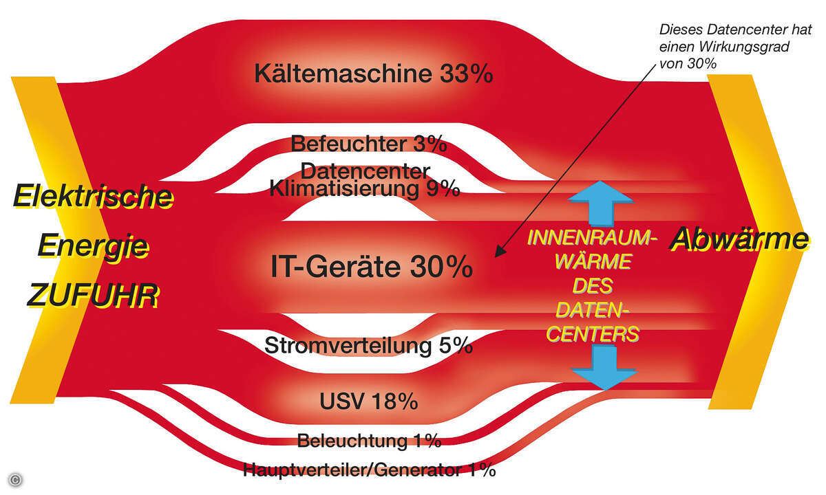 In der Praxis verlassen sich viele IT-Verantwortliche jedoch bei großen Komponenten wie USV und Klimaanlagen auf die Herstellerangaben zum Wirkungsgrad. Hier sollten in jedem Fall auch die Teillastwirkungsgrade beziehungsweise die auftretenden Verluste abgefragt werden, um eine korrekte Beurteilung zu ermöglichen.