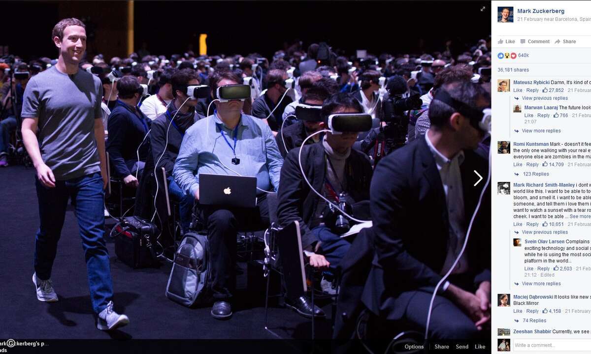 Ein Foto dieser gespenstischen Szenerie postete Zuckerberg dann später auf seinen Facebook-Account. »Ein Drogendealer konsumiert nie den eigenen Stoff« lautete der passende Kommentar eines Users unter dem Bild. Für Zuckerberg ist Virtual Reality (VR), wie er anschließend auf der Bühne betonte, die nächste große Computer-Plattform, die darüber hinaus noch eine soziale sei. Sie werde Leben und Arbeit verändern. Auch wenn die virtuelle Realität noch in einer frühen Phase befinde, das werde Beste noch kommen, sagte Zuckerberg. Denn nur mit VR-Brillen lassen sich die Videos und Fotos der Zukunft, die Freunde in sozialen Netzwerken posten, auch angemessen konsumieren. Schlimm nur, wenn man dabei die Realität komplett ausblendet.