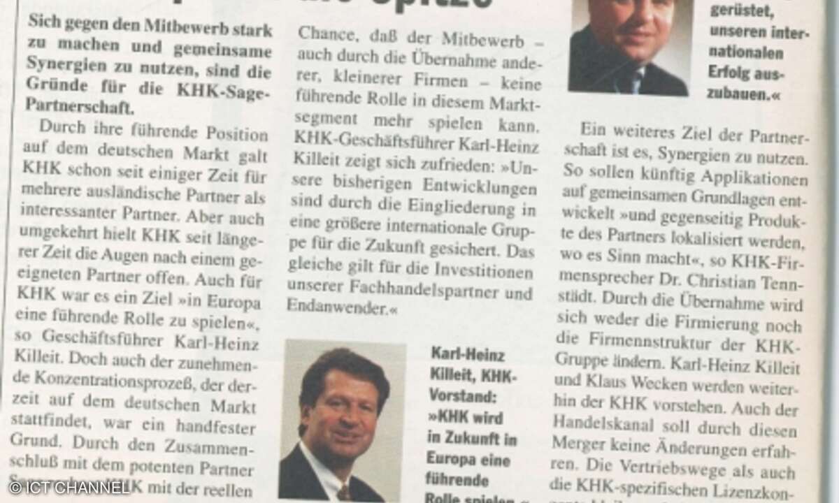 In der Ausgabe 5/97, die am 7. März 1997 erscheint, meldet CRN die Übernahme des deutschen Softwareherstellers KHK durch die britische Sage Group, die auf betriebswirtschaftliche Anwendungssoftware für kleine und mittlere Unternehmen spezialisiert ist.