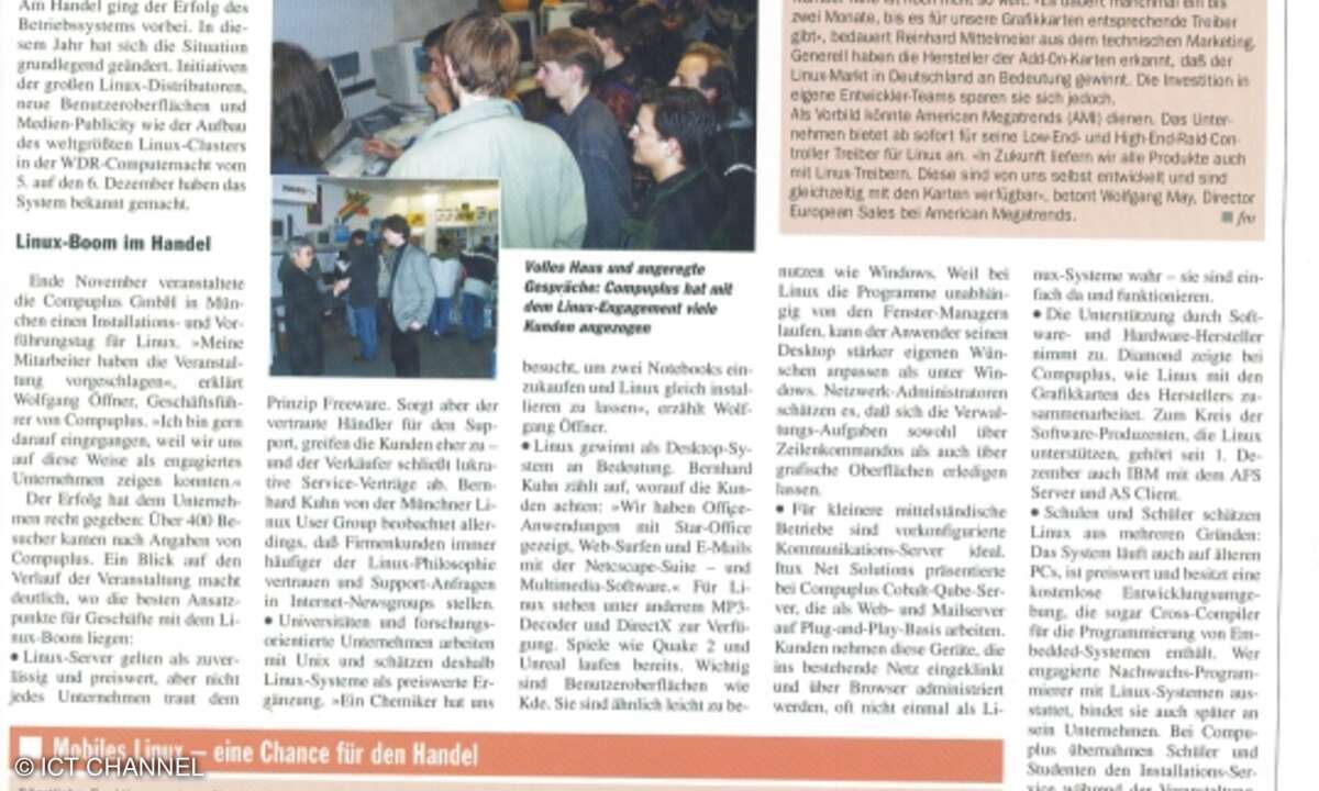 In der CRN-Ausgabe 47, die am 10. Dezember 1998 erscheint, kommt das wachsende Interesse von Anwendern an quelloffener und lizenzkostenfreier Software zur Sprache. Die Unterstützung durch Software- und Hardware-Hersteller nimmt zu. Jetzt lohnt sich für den Channel namentlich das Engagement für Linux. CRN identifiziert eine Reihe konkreter Ansatzpunkte.
