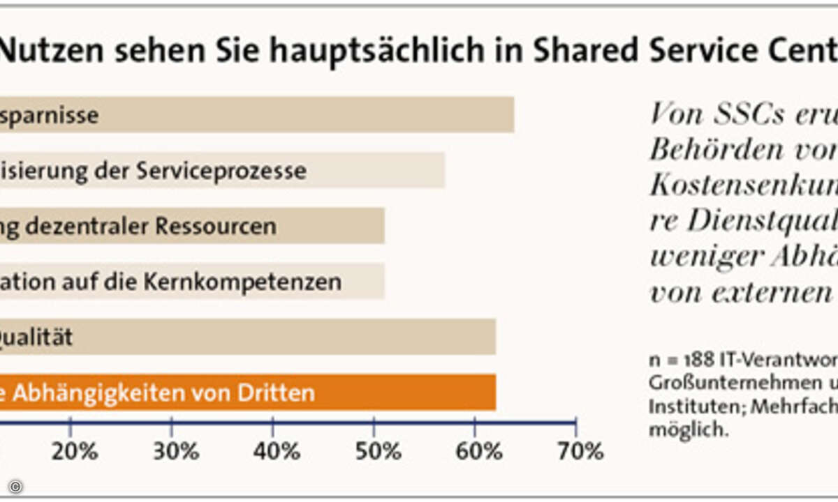 Weiter sollte auch das SSC alle geschäftlichen Anforderungen wie die bisherige Organisationsform erfüllen. Positive Skaleneffekte zur Minderung der Kosten, die Steigerung der Leistungsqualität sowie eine effizienzfördernde Standardisierung von IT-Diensten lassen sich nur erreichen, wenn alle wichtigen Anforderungen der Nutzereinheiten der SSCs erfüllt werden. Je unterschiedlicher ihr Bedarf ist, desto individueller müssen zwangsläufig die Services sein. Umso geringer sind zwangsläufig die Aussichten, die Effizienz zu steigern. Daher sind zunächst die aktuellen Anforderungen aller potentiellen Nutzergruppen und ihre eventuelle Veränderung im Lauf der Zeit genau zu analysieren. Anschließend gilt es, bedarfsgerechte organisatorische Strukturen zu bilden. SSCs erhalten deshalb immer mehr Zustimmung, weil Behörden und Verwaltung es schätzen, fachliche Funktionen zentralisieren zu können, ohne sie gleich komplett auslagern zu müssen. Werden dafür aber nicht die erforderlichen organisatorischen Strukturen und Verfahren aufgebaut, sind die erwarteten Vorteile kaum zu generieren. Um das zu vermeiden, sollten alle betroffenen Organisationsbereiche frühzeitig in die Planungen einbezogen werden. Denn ihre Akzeptanz und Unterstützung sind entscheidende Erfolgsfaktoren für die Umsetzung von SSC-Strategien.