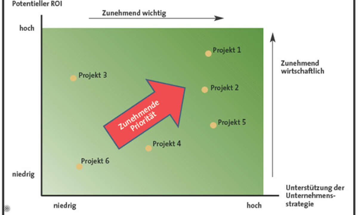 Dadurch fallen IT-Dienstleistungen in den Bereich der »Vertrauensgüter«. Bei Kauf und Nutzung von Vertrauensgütern bestehen bei Kunden Informationsunsicherheiten; deswegen greifen sie für Beschaffungsentscheidungen gerne auf Informationen zurück, die Informationen zu Beschaffenheit und Qualität ersetzen sollen, zum Beispiel auf Referenzen. Dienstleistungen werden meistens für Projekte oder projektähnliche Aktivitäten eingekauft. Beispiele sind die Auslagerung einzelner Geschäftsprozesse oder die Einführung einer neuen Software. Um Projekte zu priorisieren, kann man sie in ein Portfolio einordnen und nach Kriterien priorisieren, zum Beispiel in den Dimensionen potenzieller Return on Investment (ROI) und Unterstützung der Unternehmensstrategie (siehe Grafik links unten). Der ROI setzt den prognostizierten Erfolg einer Maßnahme, also den Rückfluss oder die Einsparungen innerhalb einer veranschlagten Zeit, ins Verhältnis zur Investition. Damit drückt er den Mehrwert einer Investition aus. »Unterstützung der Unternehmensstrategie« beschreibt das Ausmaß, in dem ein Projekt die Erreichung der Unternehmensziele unterstützt. Zur Einordnung in diese Dimension sind folgende Fragen hilfreich: