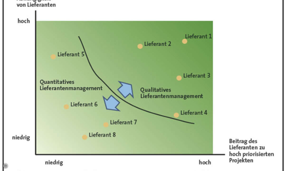 Anhand der Linie im Diagramm (siehe Grafik oben) lassen sich Lieferanten in zwei Kategorien teilen: in Lieferanten, die ein qualitatives Lieferantenmanagement benötigen und solche, die quantitativ gesteuert werden können.