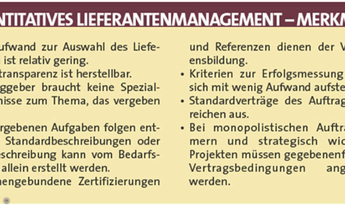 Beschaffungsstrategien für Dienstleistungen Beim Einkauf von IT-Dienstleistungen gilt es zwischen quantitativem und qualitativem Lieferantenmanagement zu unterscheiden. Beide haben unterschiedliche Regeln und Anwendungsgebiete.