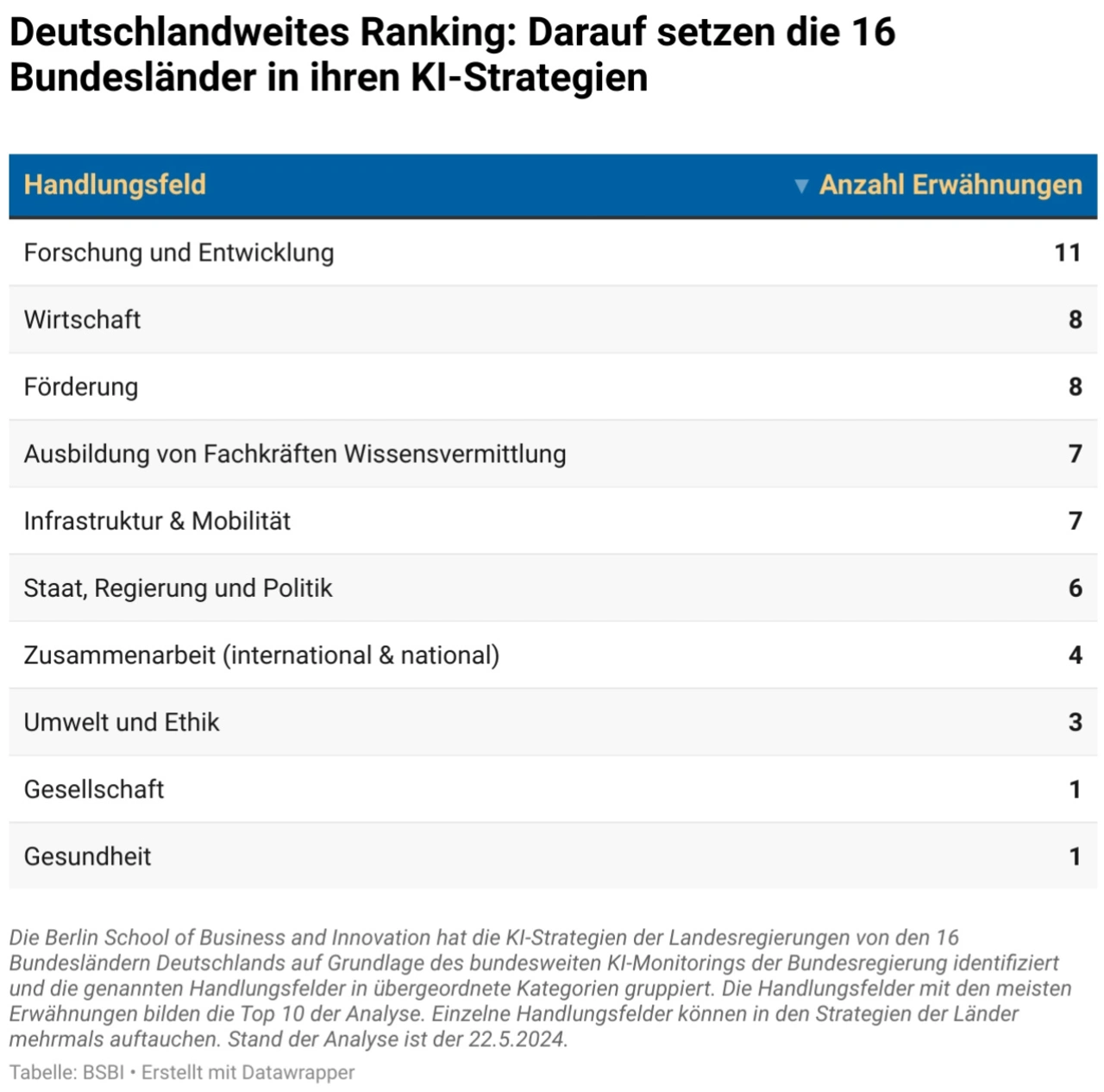Die Untersuchung zeigt deutlich, dass der bundesweite Fokus auf dem Ausbau und der Förderung der KI-Forschung und Entwicklung liegt. Das Handlungsfeld wird in den untersuchten Strategiepapieren 11-mal genannt und steht damit auf Platz 1 des Rankings.