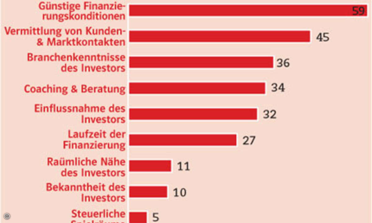 Für die Wahl der Investoren sind die Finanzierungskonditionen entscheidend (59 Prozent). Außerdem erwarten die Firmengründer, dass ihr Kapitalgeber möglichst über das entsprechende Branchen-Know-how verfügt und Kunden- beziehungsweise Marktkontakte vermitteln kann.