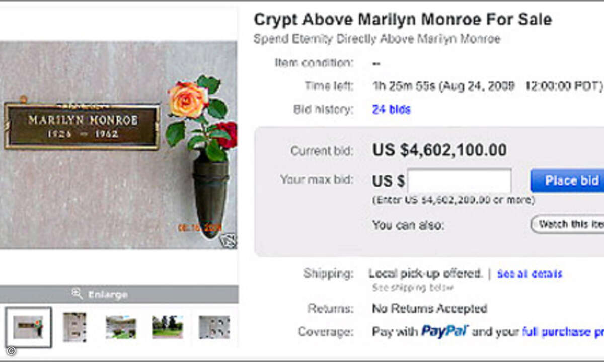Einmal der »unsterblichen« Marilyn Monroe nahe sein – auch wenn es nur um deren sterbliche Überreste handelt. Umgerechnet 3,2 Millionen Euro war dieser Wunsch einem Amerikaner wert, der im August bei Ebay eine Grabstelle direkt über der Gruft der Film-Ikone auf dem Pierce Brothers Westwood Village Friedhof in Los Angeles ersteigerte.