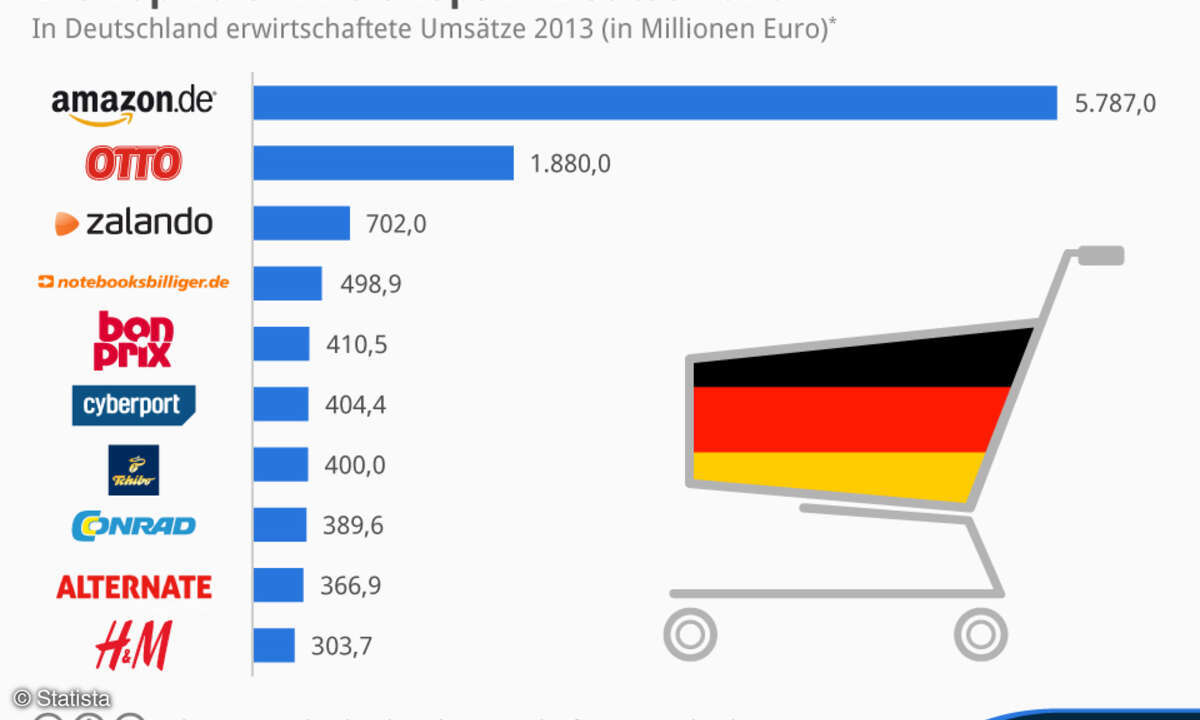 Der E-Commerce-Markt in Deutschland wächst weiter, allerdings deutlich langsamer als in den letzten Jahren. Amazon führt dabei mit deutlichem Abstand vor Otto.
