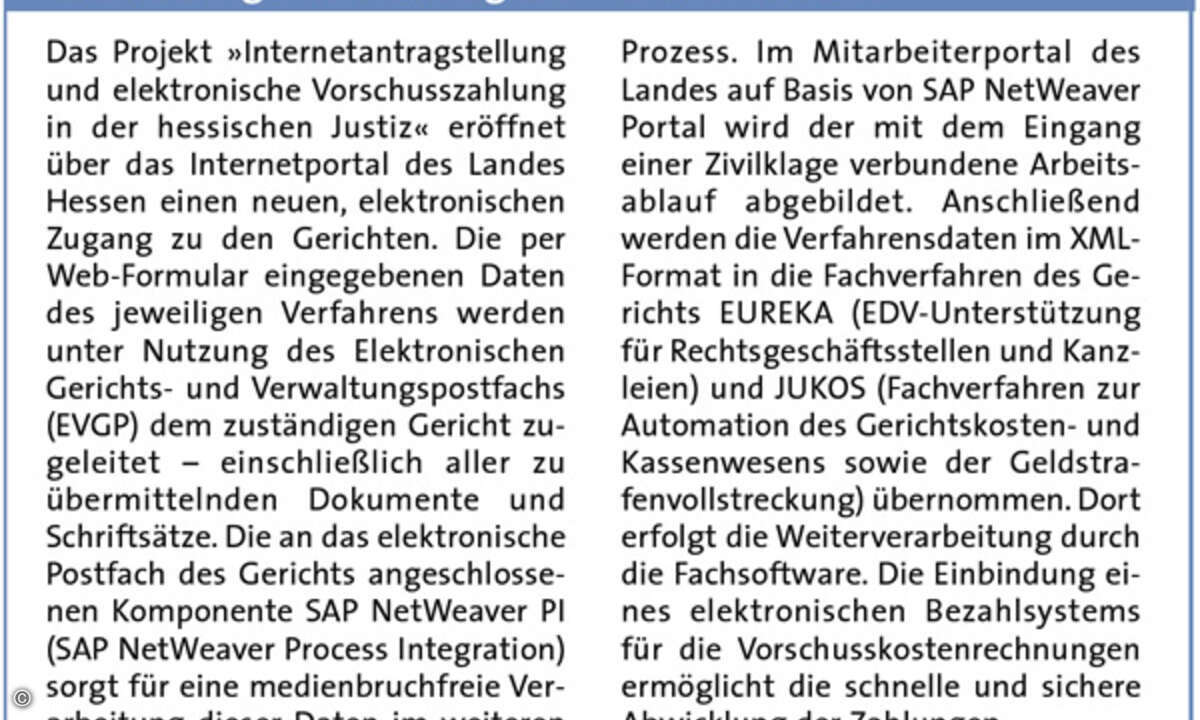 eJustice: Hessen klagen online Mit dem Projekt eJustice ebnet die hessische Justiz den Weg für den elektronischen Rechtsverkehr. Gerichte sollen entlastet, der Verwaltungsaufwand reduziert und mehr Bürgerservice erreicht werden. Beim Landgericht Limburg an der Lahn erfolgt die Klageeinreichung erstmals vollständig papierlos.
