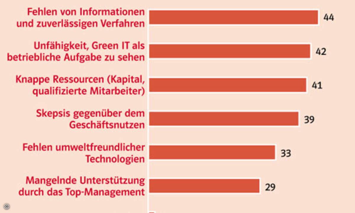 44 Prozent der Unternehmen sind der Ansicht, dass ihnen Informationen und zuverlässigen Verfahren zur Einführung umweltfreundlicher Technologien fehlen. Als fast ebenso großes Hemmnis nennen die von Deloitte Befragten die Unfähigkeit, konkrete betriebliche Aufgaben zur Umsetzung von Green IT-Initiativen zu definieren.