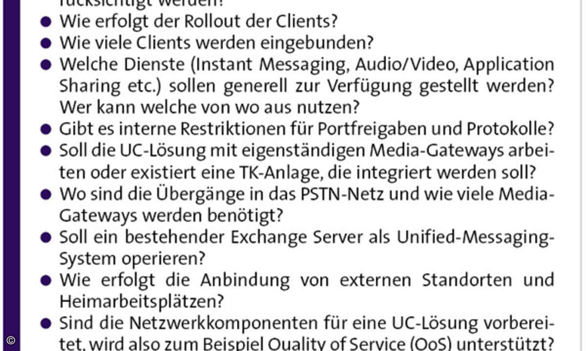 In der DMZ stehen Edge-Server für unterschiedliche Aufgaben. Beispiele sind Audio/Video-, Zugriffs-, Access- sowie Webkonferenz-Edge-Server. Sie übernehmen die jeweilige Aufgabe, egal ob die Anfrage aus dem internen oder öffentlichen Bereich erfolgt, da die DMZ vom internen und externen Netz durch Firewalls getrennt wird. Dazu kommt ein HTTP-Reverse-Proxy-Server. Treten bei einer Enterprise-Voice-Installation Fehler auf, liegen die Ursachen häufig in der DMZ. Wurden deren Protokolle und Ports nicht makellos implementiert, übermittelt ein Client zwar Funktionen wie Instant Messaging oder Anwesenheitsinformationen, kann aber keine Audio- und Videoverbindung zu anderen Benutzern aufbauen. Im Intranet befinden sich alle Applikationsserver. Sie erfüllen unterschiedliche Aufgaben. Für eine reibungslose Kommunikation werden »normale« Rufnummern beziehungsweise SIP-Adressen entsprechend dem Standort des Anwenders in das E.164-Format übersetzt (Normalisierung). Lassen sich die Teilnehmer nicht erreichen, ist meist der Übersetzungsdienst falsch konfiguriert – das E.164-Format wird nicht eingehalten. Dann sind als erstes die Konvertierungsregeln zu überprüfen. Wichtig sind auch die Medien-Gateways. Eine IP-Telefonielösung für Unternehmen muss ein- und ausgehende Anrufe übers PSTN automatisch und in einwandfreier Qualität ermöglichen. Medien-Gateways übersetzen Signale und Medien zwischen PSTN und der UC-Lösung. Die einfachste Lösung sind Basisgateways nur zur Übersetzung der Sprachpakete, ergänzt durch einen separaten Vermittlungsserver. Erweiterte Gateways integrieren auch die Funktion des Vermittlungsservers. Hybride Basismedien-Gateways verbinden Gateway und Vermittlungsserver auf Serverhardware. Das senkt Administrationsaufwand und Kosten.
