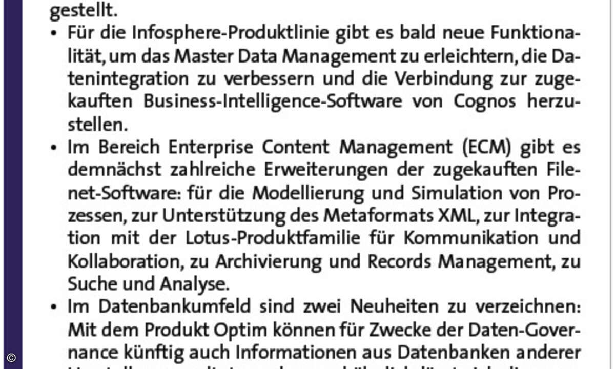 Die Ausrichtung auf geschäftliche Optimierungen erfordert laut IBM eine »Information Agenda«. Dafür hat der IT-Konzern die Erfahrungen von Kunden, die in ihrem Geschäftsfeld erfolgreich sind, für 18 unterschiedliche Branchen in Best Practices und auch in Code gegossen. Goyal betonte, dass es bei den Anwendern um konkrete Projekte gehen soll, die sich binnen sechs Monaten bezahlt machen. Die Arbeit an der Informationsagenda kann und soll freilich über ein einzelnes Projekt hinausreichen. Dabei geht es darum, Informationen strategisch zu verwalten und zu nutzen, um Geschäftsmöglichkeiten zu identifizieren, die Effizienz zu steigern und Entscheidungen zu verbessern. Mit einem Workshop sowie Software und Services von IBM sollen die Unternehmen ihre Information Agenda schneller erstellen können. Zum Tragen kommen bei der Umsetzung wesentlich die Produktlinien, die bei IBM im Bereich Information Management zusammengefasst sind. Sie betreffen die Verwaltung relationaler Daten, Dokumenten-, Workflow- und Content-Management, Business Intelligence und Business Performance Management (siehe Grafik auf Seite 34). Nach Einschätzung von Anant Jhingran, CTO des Software-Bereichs Information Management, ist IBMs IOD-Angebot inzwischen ziemlich vollständig. Gleichwohl gibt es Möglichkeiten zur Weiterentwicklung, wie die vielen Ankündigungen von Las Vegas zeigen (siehe Textkasten auf dieser Seite). Mittelfristig bietet Jhingran zufolge die Verbindung strukturierter und unstrukturierter Informationen noch viel Potenzial, ebenso die Kopplung historischer und aktueller Fakten. Der Bereich differenzierter Datenanalysen scheint vor einem Aufschwung zu stehen: Zeitreihen, Events und Streams, die Suche in Texten und die Auswertung sozialer Netzwerke nannte der Experte als vielversprechende Forschungsgebiete.