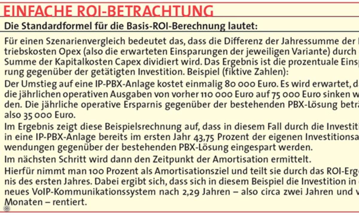 Wer seine Kommunikationsinfrastrukturen modernisieren will, muss in der Regel mit erheblichen Ausgaben rechnen. Dabei handelt es sich oft um langfristige Investitionen, die einen relativ hohen Anteil an den Gesamtkosten ausmachen. Doch nicht nur in den Investitionsausgaben, den so genannten Capex (capital expenditures) steckt ein großer Anteil an den Aufwendungen für Kommunikationsleistungen. Sehr erheblich sind auch die Ausgaben für Betrieb und Wartung der beschafften Lösungen, also die Opex (operational expenditures). Da wundert es nicht, wenn Unternehmen im Bereich ihrer Telekommunikation immer wieder nach Einsparpotenzialen suchen. Ein erster Ansatz ist meist die Überlegung, eventuell eine Voice-over-IP-Lösung einzusetzen. Doch hat sich das Versprechen mancher Anbieter, mit Voice over IP bis zu 70 oder 80 Prozent der Kommunikationskosten im Unternehmen einzusparen, mittlerweile als meist unhaltbar herausgestellt. Statt solchen Aussagen zu glauben, ist es wesentlich sinnvoller, die Auswirkungen anhand der individuellen Gegebenheiten zu untersuchen. Dabei haben sich mit der einfachen und der erweiterten Betrachtung des ROI (Return on Investment) zwei Methoden bewährt.