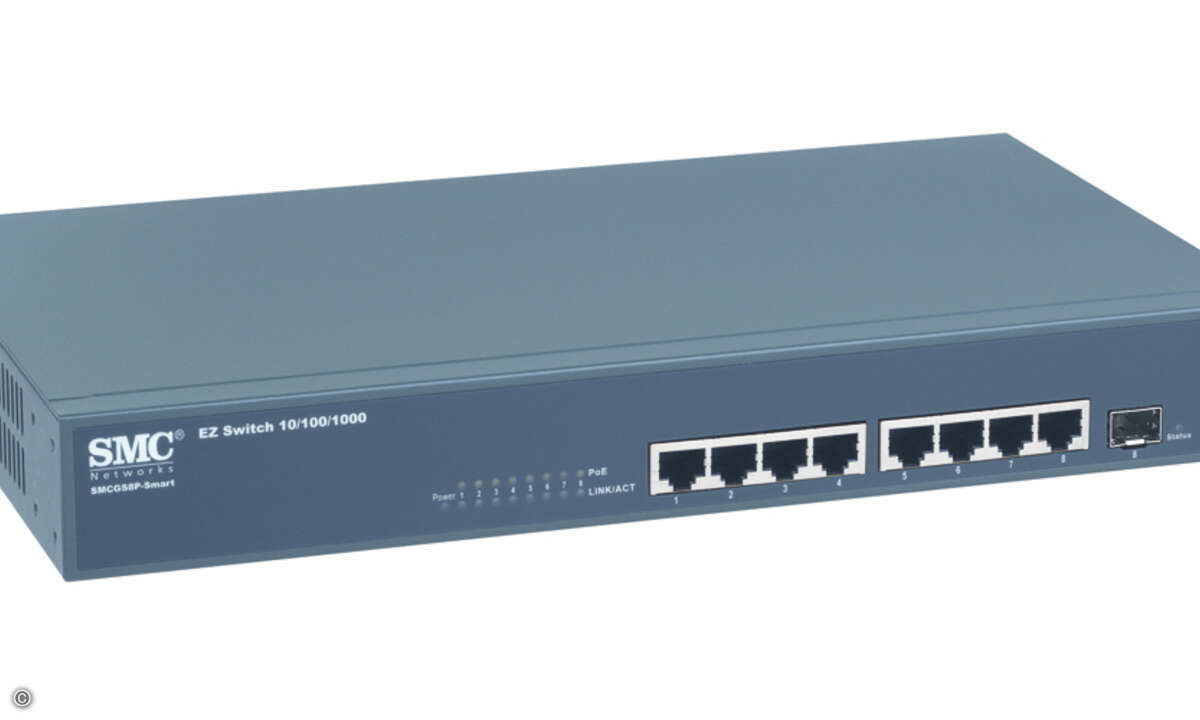 Speziell für den Einsatz in mittelständischen und kleinen Unternehmen ist der EZ-Switch SMCGS8P-Smart von SMC Networks ausgelegt. Er hat acht Ports für Gigabit-Ethernet und unterstützt Power over Ethernet.