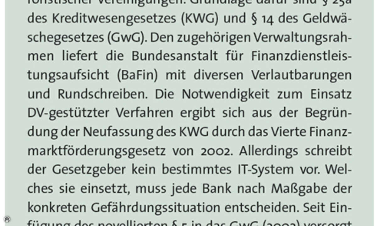 Generell gilt: »Das Indizienmodell muss die bankindividuelle Gefährdungssituation abbilden. Je feiner die Regeln und Schwellenwerte des Programms darauf abgestimmt sind, desto weniger falsche Treffer müssen manuell bearbeitet werden«, sagt Erich Schaper, Geldwäschebeauftragter der Hannoverschen Volksbank. Sein Institut nutzt die Gemeinschaftslösung nach einer mehrmonatigen Testphase seit knapp einem Jahr. In dieser Zeit wurden rund 30 der 80 Default-Indizien modifiziert und etwa 20 neu hinzugefügt. »Programmieren muss man dafür nicht können. Gute Tabellenkalkulations- oder Datenbankkenntnisse sind zum Verständnis aber hilfreich«, sagt Schaper. Statt einer Score-Bildung über einen längeren Zeitraum favorisiert er die tägliche Inspektion aller von dem Programm herausgefilterten Indizientreffer. Den Aufwand dafür begrenzt er mit einem Add-On, das die Ergebnismenge auf Basis einer Reporting-Lösung online auswertet und das ebenfalls von der GAD bereitgestellt wird. Sein Resümee: »Mit der Software konnten wir das vorgeschriebene Risikomanagement auf effiziente Weise nach unseren eigenen Vorstellungen verwirklichen.« Anzumerken bleibt, dass die Lösung nicht auf ein bestimmtes Transaktionssystem limitiert ist, sondern über offene Schnittstellen prinzipiell mit jeder Bankenplattform zusammenarbeitet – eine Option, von der zwischenzeitlich auch etliche nichtgenossenschaftliche Privatbanken Gebrauch machen.
