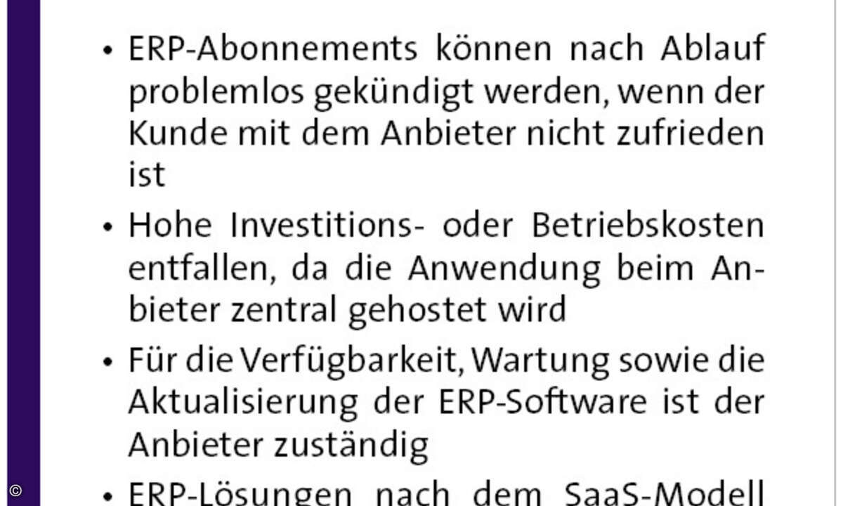 Das Prinzip hinter ERP als SaaS ist sehr einfach. Die ERP-Software muss nicht mehr als Suite oder in einzelnen Modulen eingekauft und vor Ort auf der vorhandenen IT-Infrastruktur installiert werden. Vielmehr stellen die Softwarefirmen ihre Anwendungen als Service bereit, auf den jeder Anwender über das Internet zugreifen kann. Der Vorteil für die Kunden liegt auf der Hand: Hard- und Software müssen nicht mehr vor Ort installiert, gewartet und aktualisiert werden. Das spart Investitions- und Betriebskosten, das ohnehin knappe IT-Personal kann sich um den Tagesbetrieb kümmern. Basis für ein professionelles SaaS ist eine mandatenfähige Architektur seitens des Anbieters. Dabei teilen sich die Nutzer sowie die Applikation eine gemeinsame Infrastruktur. Hohe Sicherheitsstandards sind in so einem Umfeld obligatorisch. Die Verwaltung und Wartung der Plattform erfolgt an zentraler Stelle. Aufgrund der einheitlichen Architektur hat jeder Nutzer die Möglichkeit, im Rahmen des gebuchten Service die Software an die individuellen Anforderungen seiner Geschäftsprozesse anzupassen. Über das Internet wird darüber hinaus ein flexiblerer Zugriff auf die ERP-Anwendungen eines Unternehmens möglich. Auch der mobile Mitarbeiter kann von unterwegs über einen Notebook, PDA oder ein Smart-Phone auf die für ihn relevanten Daten zugreifen, diese bearbeiten oder aktualisieren. Sicherheitsregeln, die jedes Unternehmen nach seinen spezifischen Anforderungen einrichten kann sorgen dafür, dass nur berechtigte Personen auf die ERP-Applikation oder einzelne Module der Software zugreifen. Daten, die unterwegs oder im HomeOffice bearbeitet werden, stehen über SaaS allen Beteiligten eines Unternehmensprozesses sofort zur Verfügung. Jeder Mitarbeiter kann daher mit aktuellen Daten arbeiten, ohne dass zeit- und kostenintensive Änderungsprozesse ablaufen müssen.