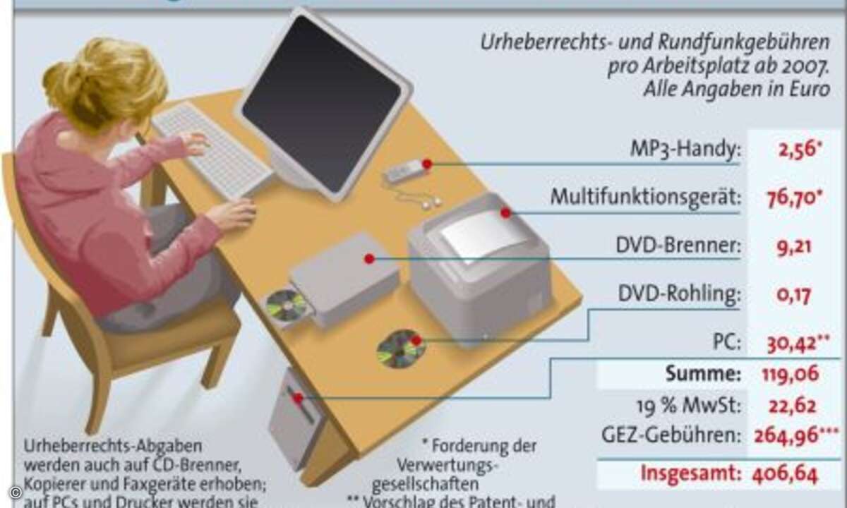 Der klassische Arbeitsplatz wird mit mehr als 400 Euro Gebühren für Urheberrecht und GEZ belastet. Zu den aufgeführten Abgaben können noch Urheberrechts-Abgaben auf CD-Brenner, Kopierer und Faxgeräte erhoben werden.