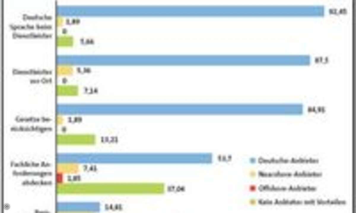 Die Vergabegrundsätze in den unterschiedlichen Entwicklungsphasen bieten den deutschen Anbietern strategische Vorteile. Da die Kompetenzen der heimischen Dienstleister in der Planungsphase am höchsten eingeschätzt werden, bestehen gute Chancen, frühzeitig ein solides Kundenverhältnis aufzubauen. 89 Prozent der Unternehmen halten eine enge Zusammenarbeit von Fach- und IT-Experten in den frühen Phasen eines Projekts für erfolgsentscheidend. Dabei können die Onshore-Anbieter nach Angaben der IT-Experten auch die wichtigsten Outsourcing-Faktoren von Softwareprojekten besser erfüllen, als ausländische Wettbewerber. Die genaue Abdeckung der fachlichen Anforderungen durch die Software halten 87,5 Prozent der Unternehmen für sehr wichtig. Der Grundstein für dieses Erfordernis wird in der frühen Planung gelegt. Knapp zwei Drittel der Befragten setzen zudem höchste Priorität auf Zuverlässigkeit und Robustheit der Software im praktischen Einsatz. Auch hier werden die Weichen oftmals in der frühen Konzeption gestellt. 60 Prozent der Unternehmen halten zudem die Kontinuität bei Wartung und Weiterentwicklung der Software für einen sehr wichtigen Faktor. Heimische Anbieter können hier ihren Standortvorteil nutzen und vor Ort Vertrauen schaffen.