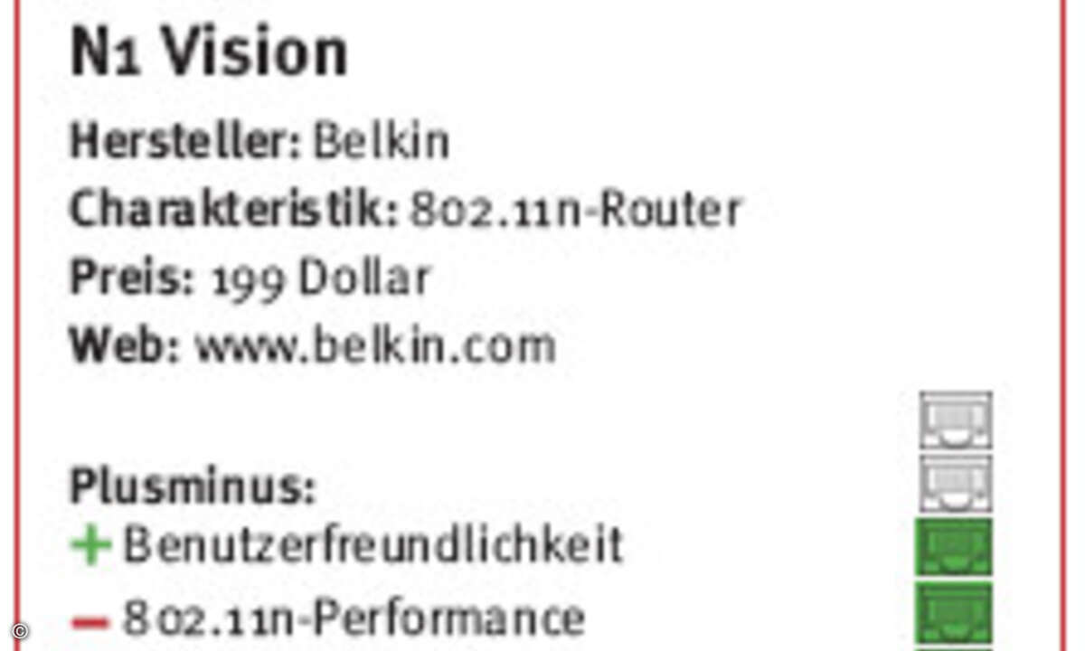 Der Belkin-N1-Vision ist ein gefälliger Router mit LCD. Das macht es dem Benutzer leicht, Informationen über die Arbeit des Geräts abzulesen. Leider hat das System einen stolzen Preis: 199 Dollar. Die Performance des N1-Vision lässt zu wünschen übrig – außer einer Verbesserung der Reichweite wird ein Benutzer in einer gemischten Installation kaum einen Unterschied zu einem G-Router bemerken.