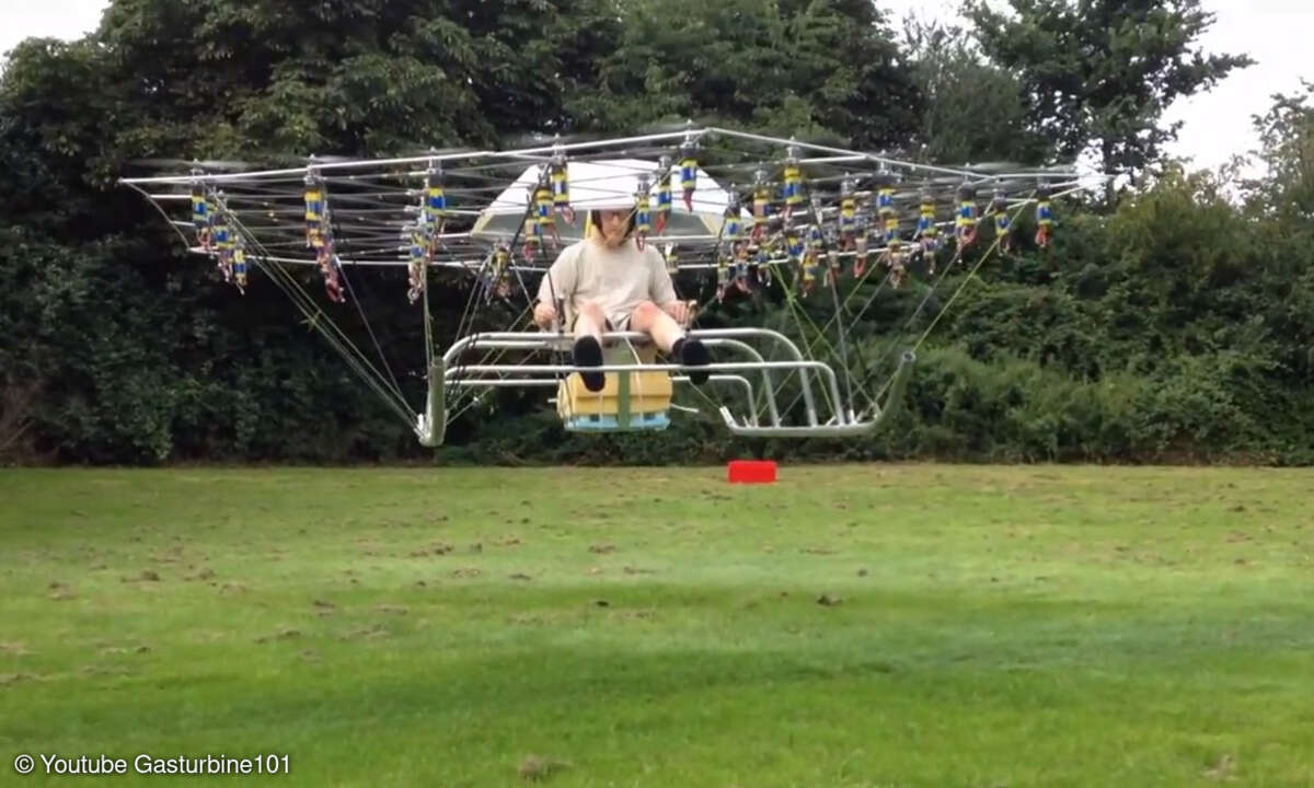 Ein britischer Bastler hat sich in der heimischen Garage einen eigenen Helikopter zusammengebaut, der von 54 Modelbaupropellern und -Motoren in die Luft gehoben wird.