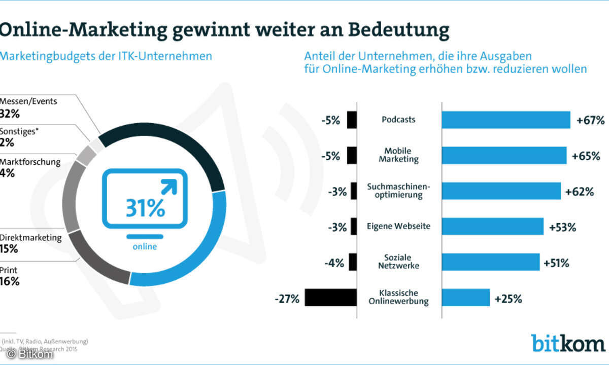 »Online-Marketing gewinnt weiter an Bedeutung und hat inzwischen eine vergleichbare Bedeutung wie Messen und Events«, sagt Bitkom-Marketingexperte Markus Altvater. »Gerade online können Unternehmen sehr genau spezifische Zielgruppen ansprechen und auch in den direkten Dialog mit Kunden und Interessenten treten«.