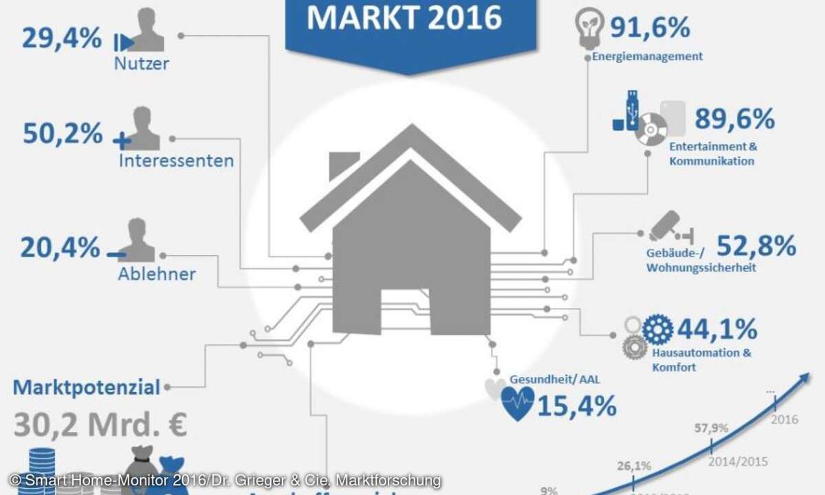 Das Marktforschungsinstitut Dr. Grieger & Cie. hat in Zusammenarbeit mit der Smart Home Initiative Deutschland im Rahmen einer repräsentativen Umfrage 1.017 Deutsche zum Thema Smart Home befragt. Demzufolge nutzen bereits 30 Prozent der Haushalte Smart Home-Anwendungen. Vielen war dies vor der Befragung gar nicht bewusst. Gut die Hälfte der Teilnehmer hat Interesse an smarten Assistenten und lediglich jeder Fünfte lehnt eine Nutzung momentan grundsätzlich ab. Gründe für die Ablehnung finden sich vorrangig in den (vermeintlich) hohen Kosten für Anschaffung, Einbau und Betrieb der Anwendungen. Zudem herrscht unter den Anwendern eine latente Unsicherheit hinsichtlich des Datenschutzes. Als weiteres Hemmnis wird die Inkompatibilität von Geräten unterschiedlicher Hersteller angesehen. Dies spiegelt sich in dem Wunsch der deutschen Interessenten und Nutzer wider, die Steuerung aller Smart Home-Anwendungen über eine einzige App vorzunehmen.
