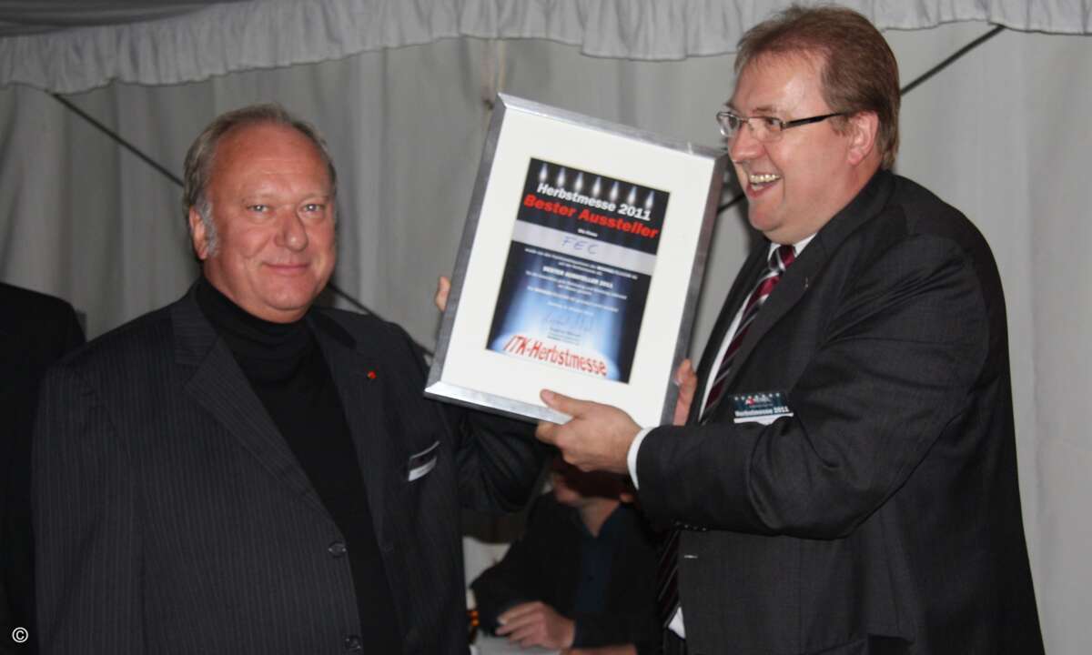 Während der Michael Telecom Herbstmesse hatten die Besucher Gelegenheit, den besten Aussteller zu wählen. Die meisten Stimmen konnte Funkwerk Enterprise Communications auf sich vereinen. Sichtlich erfreut nahm FEC Channel-Manager Hans-Jürgen Schneider (FEC Channel Manager) die Urkunde aus den Händen von Michael Telecom-Vorstand Siegfried Michael entgegen.