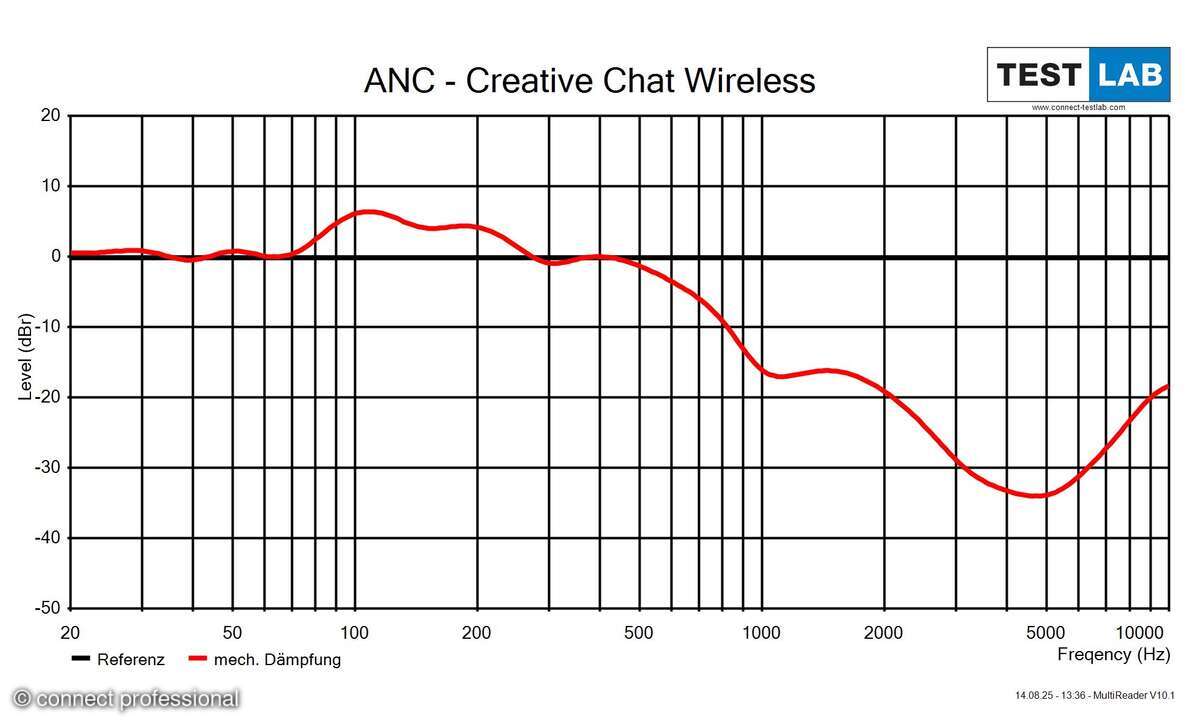 Die Messungen bestätigen dem Creative Chat Wireless bei Medien- und Musikwiedergabe einen insgesamt recht ausgeglichenen Frequenzgang mit starken Bässen, leichter Mittenbetonung und in den Höhen einen Abfall, der etwas früher einsetzt als gewöhnlich. Das On-Ear-Headset dämpft hochfrequenten Lärm aus der Umgebung recht gut, in mittleren und tiefen Frequenzlagen ist es – auch wegen der fehlenden aktiven Geräuschunterdrückung (ANC) – transparent.