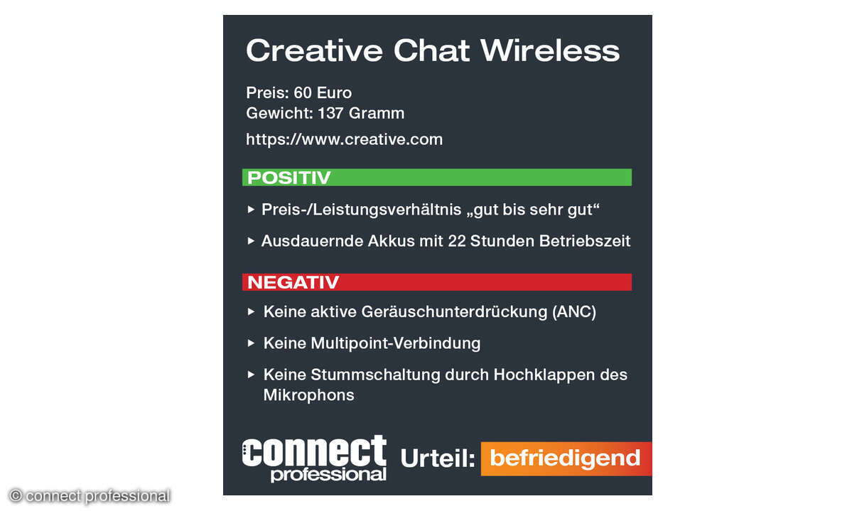 Mit dem Chat Wireless ist es dem Sound-Spezialisten Creative gelungen ein kompetentes, aufs Wesentliche reduziertes Headset anzubieten. Das strenge connect-professional-Testverfahren ist an mehrfach so teure Headsets angepasst – dies zur Einordnung des erzielten ehrlichen „befriedigend“. Das Preis-/Leistungs-Verhältnis ist „gut bis sehr gut“. Damit können auch Chatter mit stark begrenztem Budget in den Genuss dieser Kommunikationserleichterung kommen.