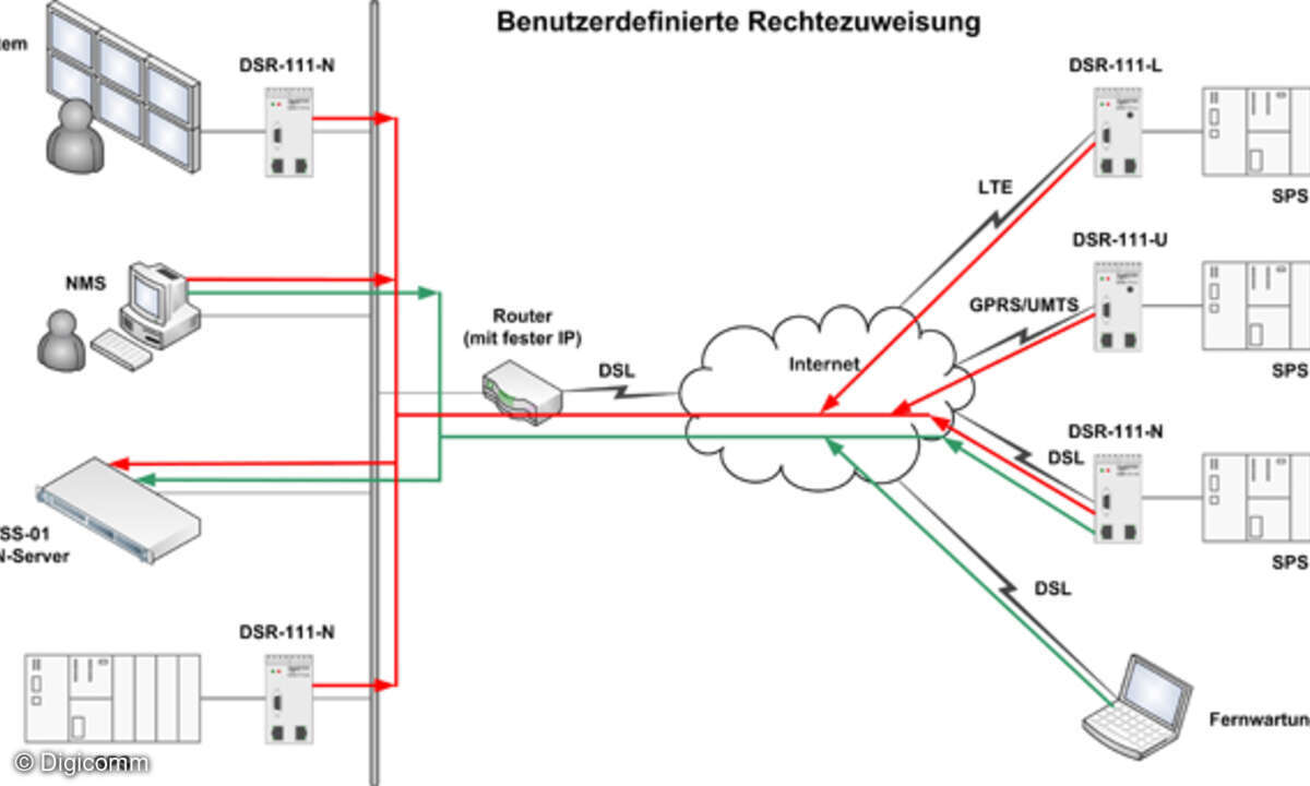 - Ebenfalls werden alle Fernwirkstationen des eigenen Netzwerkes (Forderungen Punkt 1) mit DSR-Routern ausgerüstet um eine geschlossene Benutzergruppe mit VPN-Schutz zu erreichen.