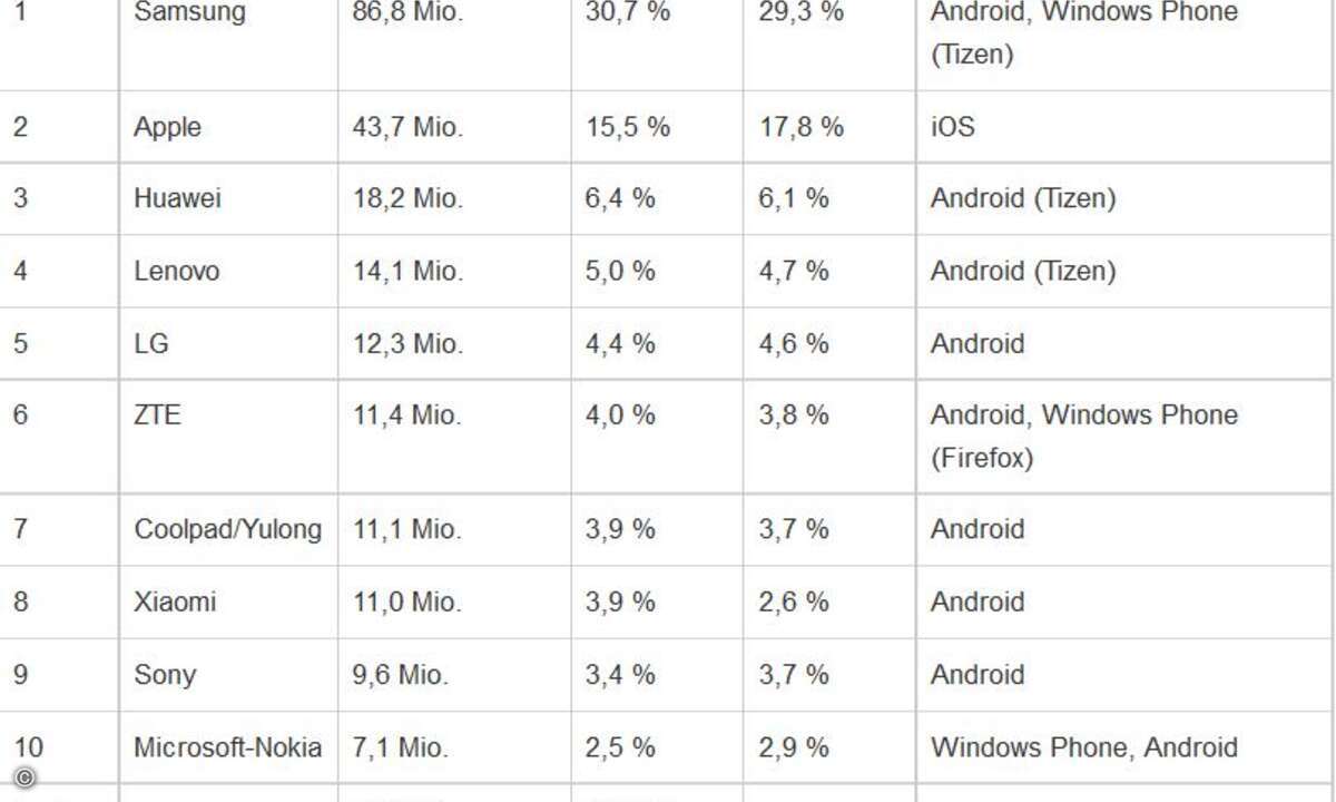 Bei den Smartphone-Herstellern führt weiterhin der koreanische Elektronikkonzern Samsung die Rangliste an und konnte seinen Marktanteil sogar noch leicht steigern (Tabelle 2). Apple verlor weitere Marktanteile, vor allen Dingen wegen schwächelnder iPad-Verkäufe. Der chinesische Hersteller Xiaomi konnte sich mit Platz 8 erstmals in den Top-10 platzieren und seinen Marktanteil gleich um 1,3 % steigern.