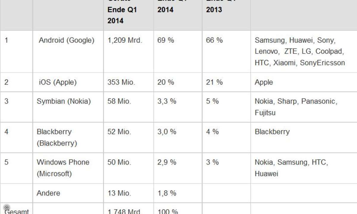 Am Ende von Q1 2014 waren weltweit 1,748 Mrd. Smartphones in Betrieb. Schaut man sich diese sogenannte installierte Basis von Betriebssystemen an (Tabelle 3), stellt man fest, dass Apple auf Grund seines zeitlichen Vorsprungs immer noch einen Marktanteil von über 20 % hält.