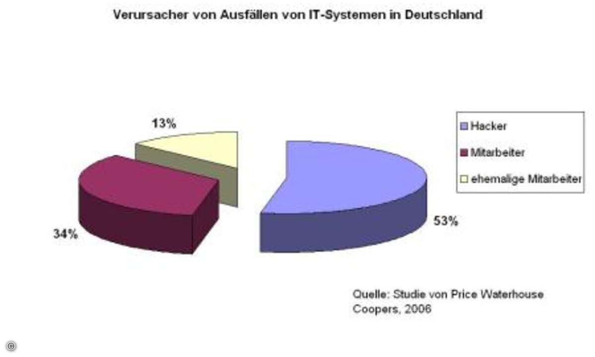 In Deutschland ging laut PwC die Hälfte der durch Sicherheitsmängel bedingten Ausfälle von IT-Systemen auf das Konto von Hackern. Für mehr als ein Drittel der Probleme (34 Prozent) waren laut PwC die eigenen Mitarbeiter verantwortlich, in 13 Prozent (weltweit 19 Prozent) ehemalige Angestellte.