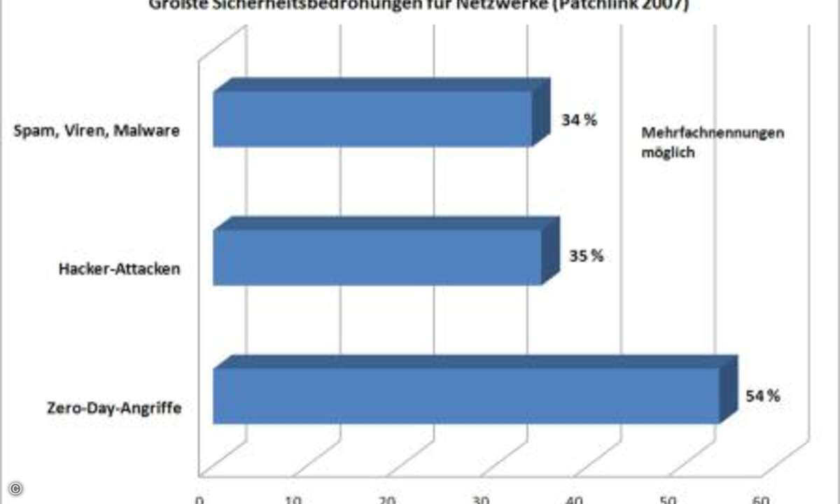 An die 54 Prozent der Befragten schätzen Zero-Day-Attacks als größte Gefahr für Unternehmensnetze ein. Diese Angriffsform nutzt Sicherheitslücken, für die noch keine Patches bereitstehen.