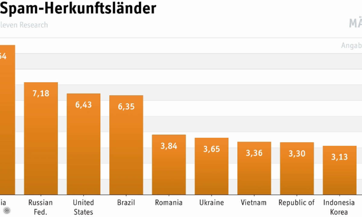 Große Veränderungen nach dem ende von Rustock zeigten sich vor allem auch in der Karte der Herkunftsländer von Spam-Mails. Da sich die Kontrollstrukturen ebenso wie viele der eingeklinkten Zombie-PCs des Botnetzes in den USA befunden hatten, konnten die Vereinigten Staaten nach seiner Abschaltung den unrühmlichen ersten Platz unter den Spam-Ursprungsorten (6,4 Prozent) wieder an Indien (9,5 Prozent) abgeben und sich hinter Russland (7,2 Prozent) auf dem dritten Rang neu einreihen. Platz 4 belegte der ehemalige Spitzenreiter Brasilien (6,4 Prozent), gefolgt von Rumänien (3,8 Prozent) und der Ukraine (3,7 Prozent). Schönes Detail am Rande: Erstmals seit Beginn der eleven Security Reports im Jahr 2009 gehörte Deutschland im März nicht mehr zu den Top 10 der Spammer-Nationen.