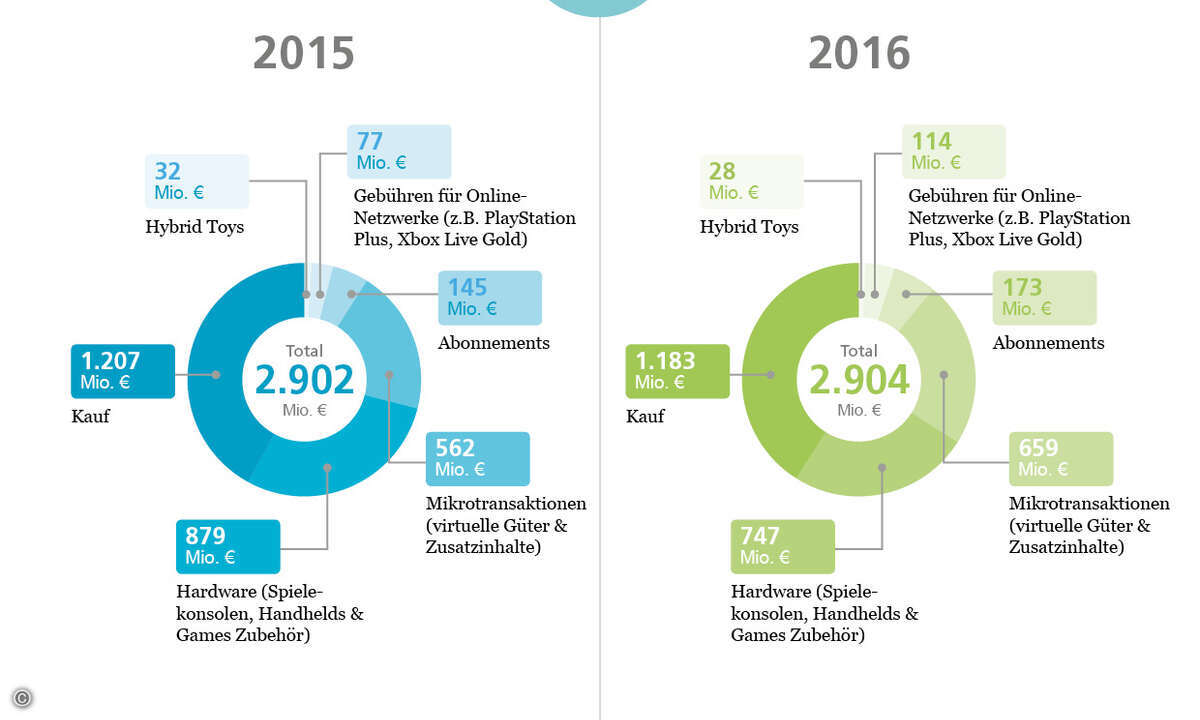 Gleichzeitig führt diese Verschiebung dazu, dass immer weniger Spiele auf klassischem Wege als Box gekauft werden. Zwar wird in diesem Bereich aktuell noch immer der größte Umsatz erzielt, allerdings sinkt die Bedeutung stetig. Mit rund 1,18 Milliarden Euro wurden 2016 rund zwei Prozent weniger Umsatz mit Spielekäufen generiert als noch im Vorjahr. Hinzu kommt eine immer stärker werdende Konkurrenz durch Download- und Spieleplattformen wie Steam, die einen wachsenden Anteil der Verkäufe für sich verbuchen können.
