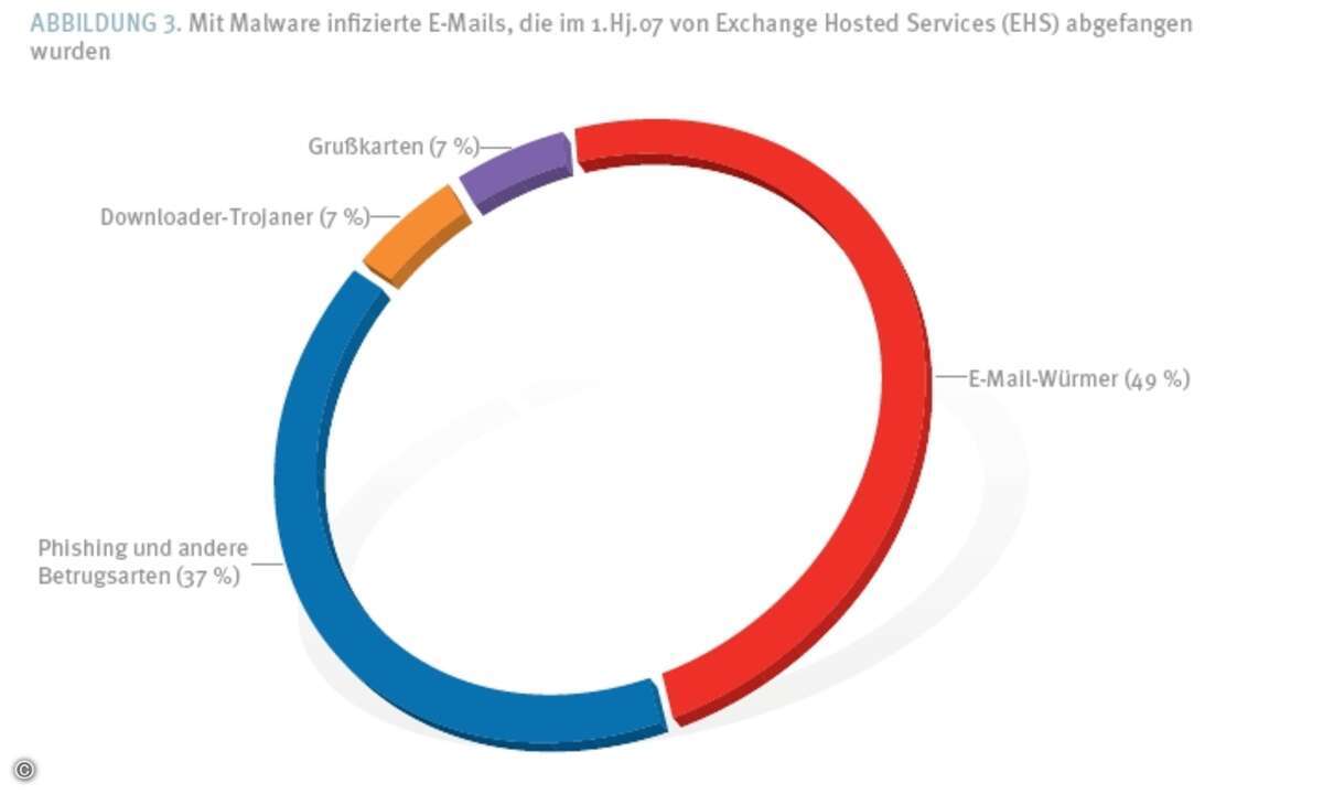 Bei E-Mail-gestützter Malware geht der Trend klar in Richtung Phishing. Der Anteil solcher Attacken stieg von 27 Prozent (2006) auf 37 Prozent. Die »Verlierer« im ersten Halbjahr waren Würmer und Downloader-Trojaner.
